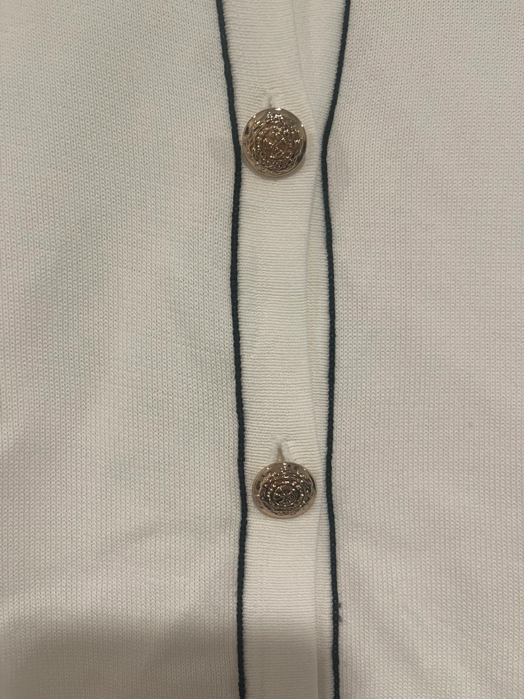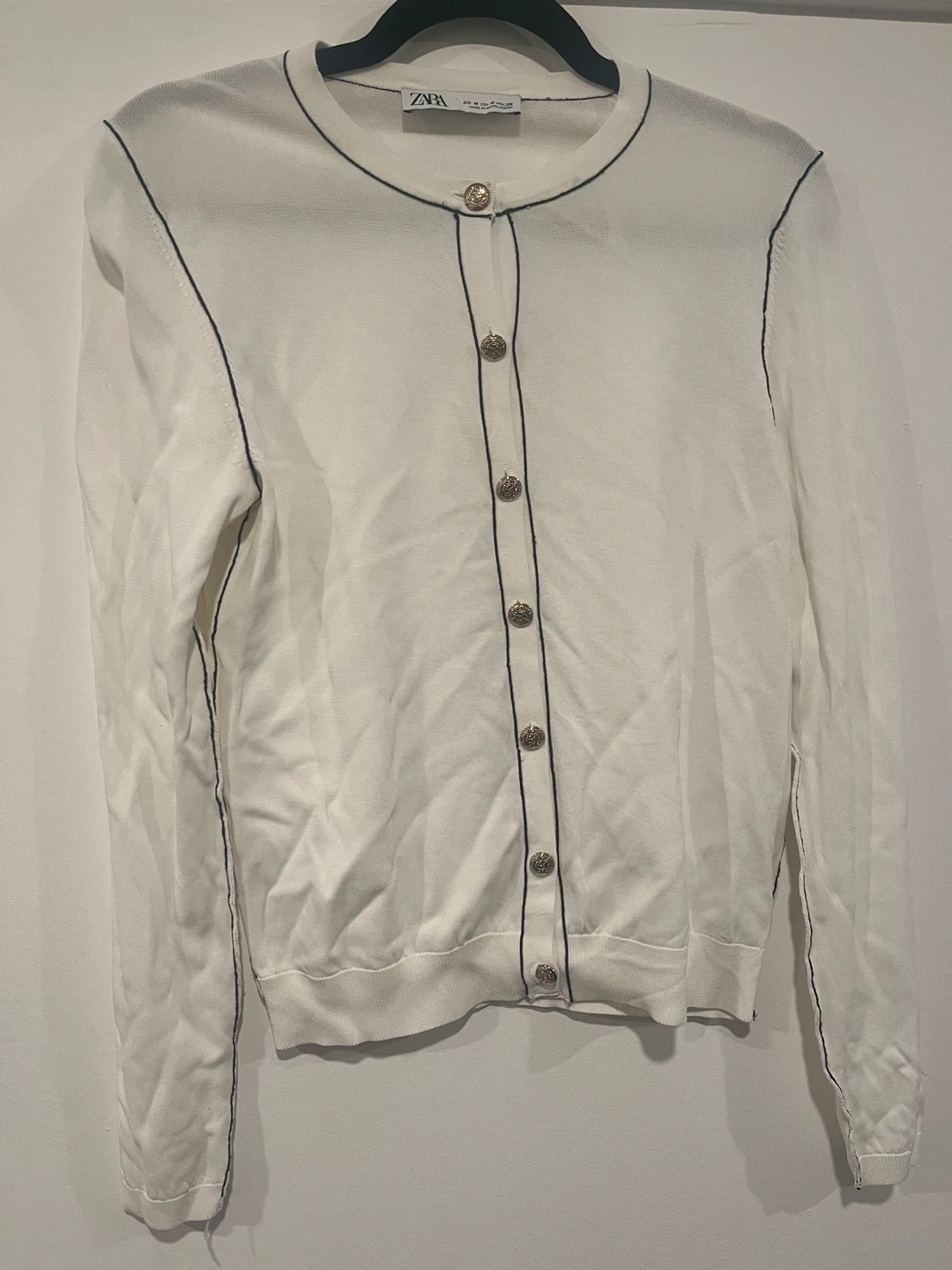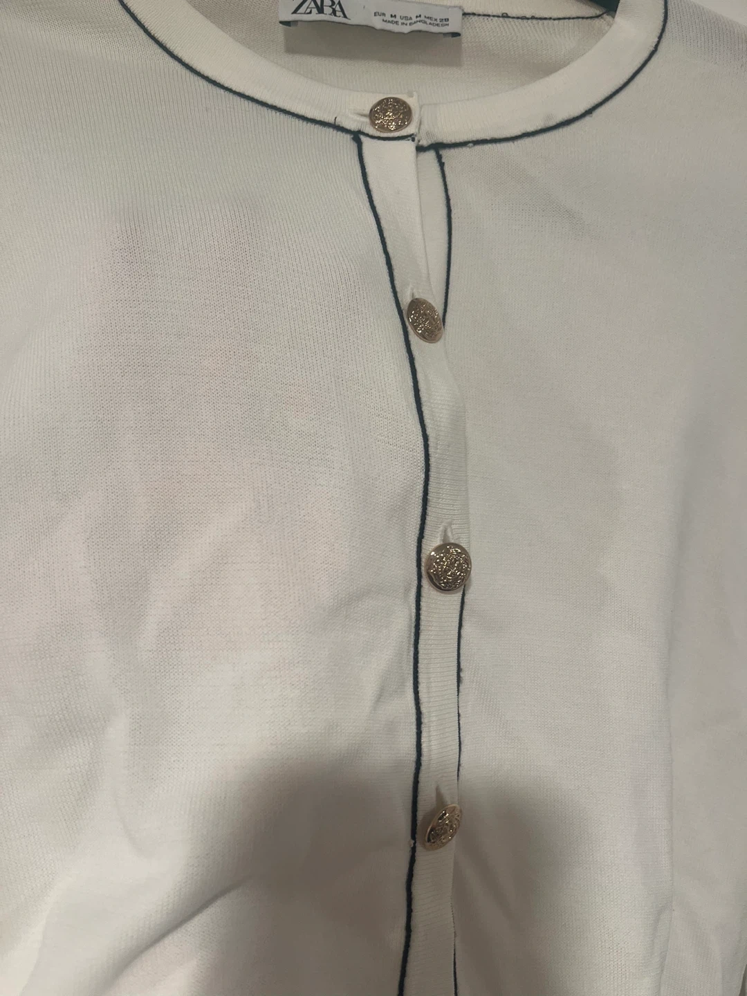 White Zara cardigan with black trim and decorative gold buttons. It's a size medium. There's a small hole near the hem on one side. Easy fix. Condition is like new otherwise.