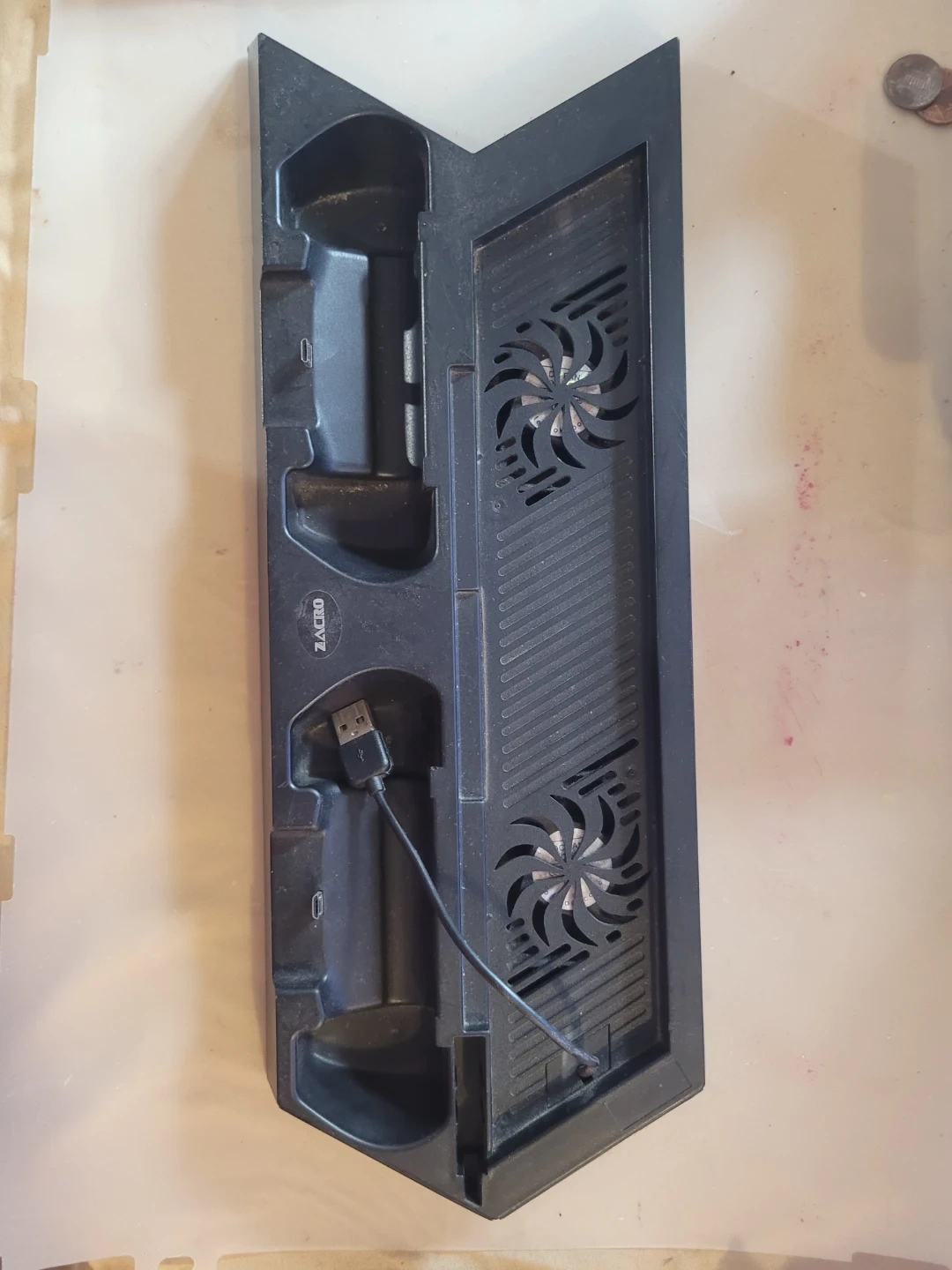 This is a black vertical charging stand for PS4 controllers. It features dual cooling fans to help keep your console from overheating. It comes with a USB cable for power. The stand can charge two controllers simultaneously.
