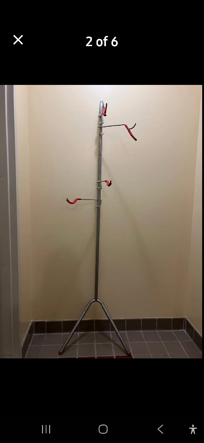 Selling a bike stand in great condition! It has a silver finish with red accents. Perfect for storing your bikes indoors or in a garage