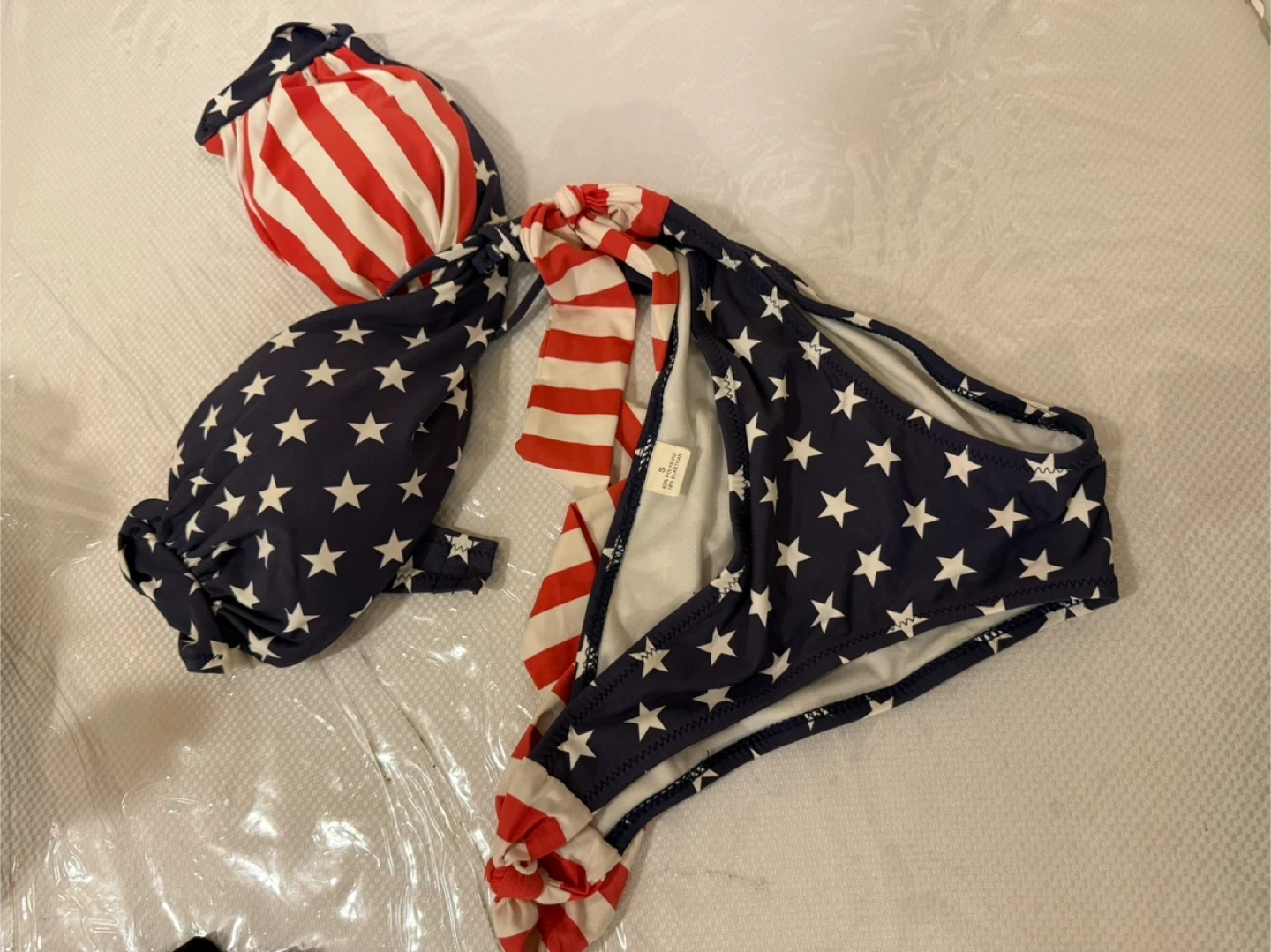10bikini with an American flag design! This cute bikini is a size small and features a red and white striped top and navy blue bottoms with white stars. Perfect for the summer!