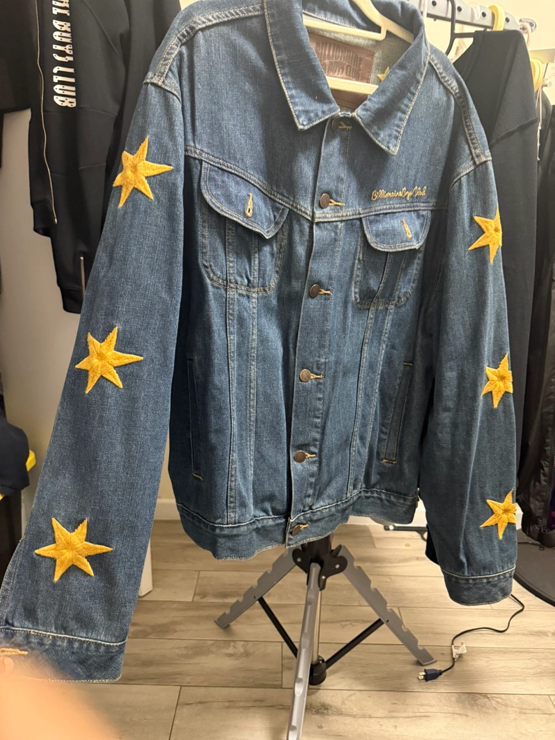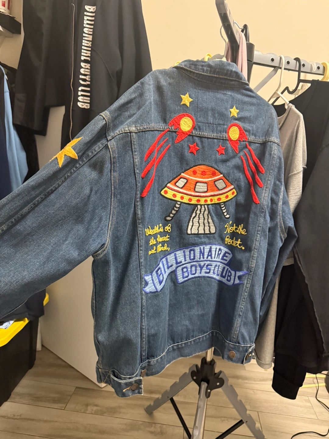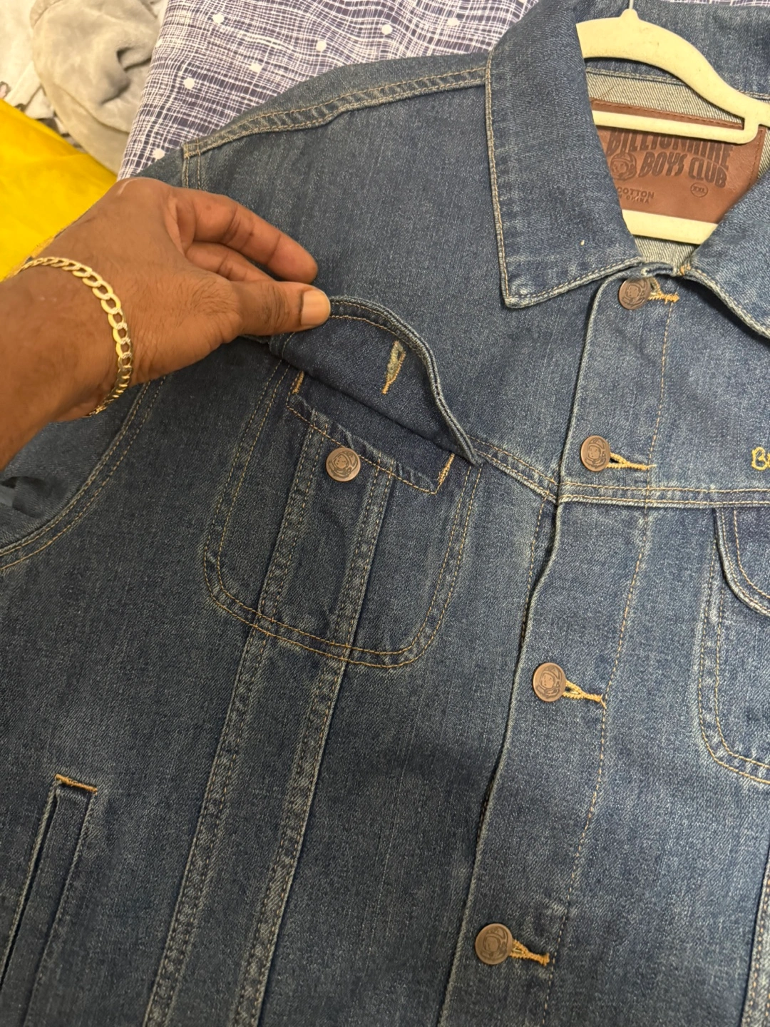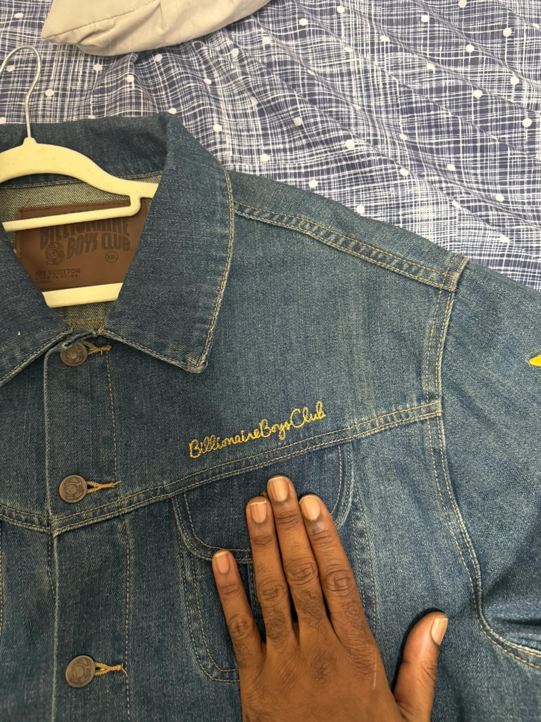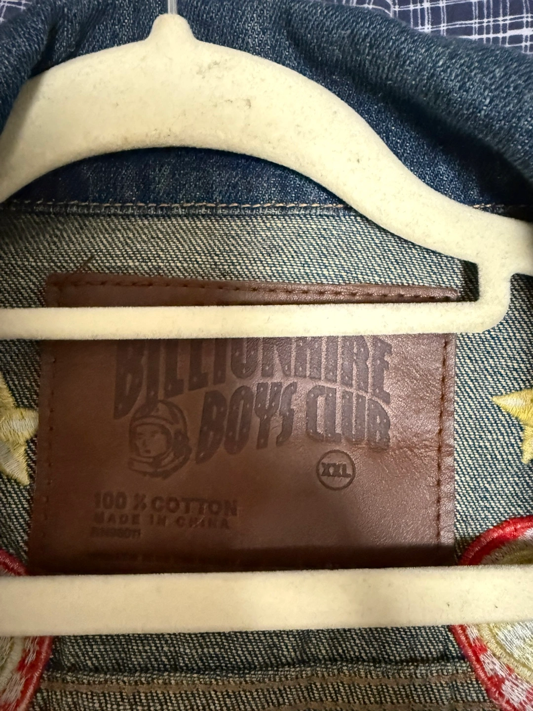 10Selling a Billionaire Boys Club denim jacket in size XXL. It's a stylish piece with unique detailing and embroidery. The jacket is made of 100% cotton. Perfect for adding a cool, casual vibe to your wardrobe!