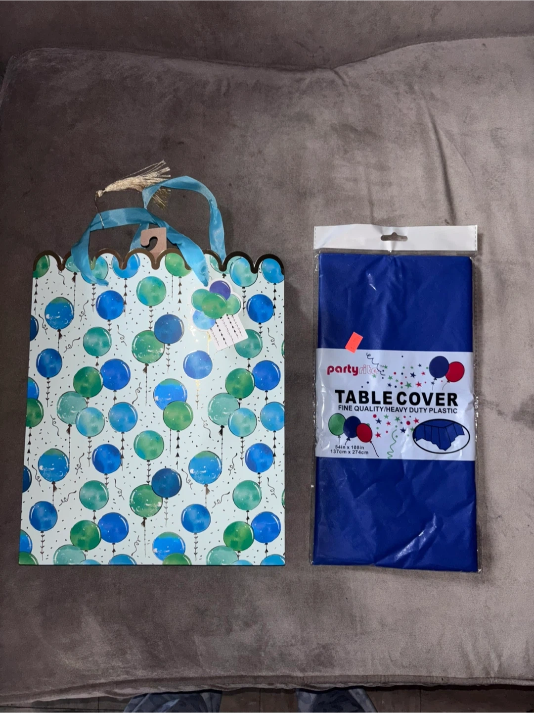 1000+I have a birthday boy party hat and some party decorations available. The set includes a party hat, a balloon-themed gift bag, and a blue plastic table cover. Perfect for a 1st birthday boy celebration!