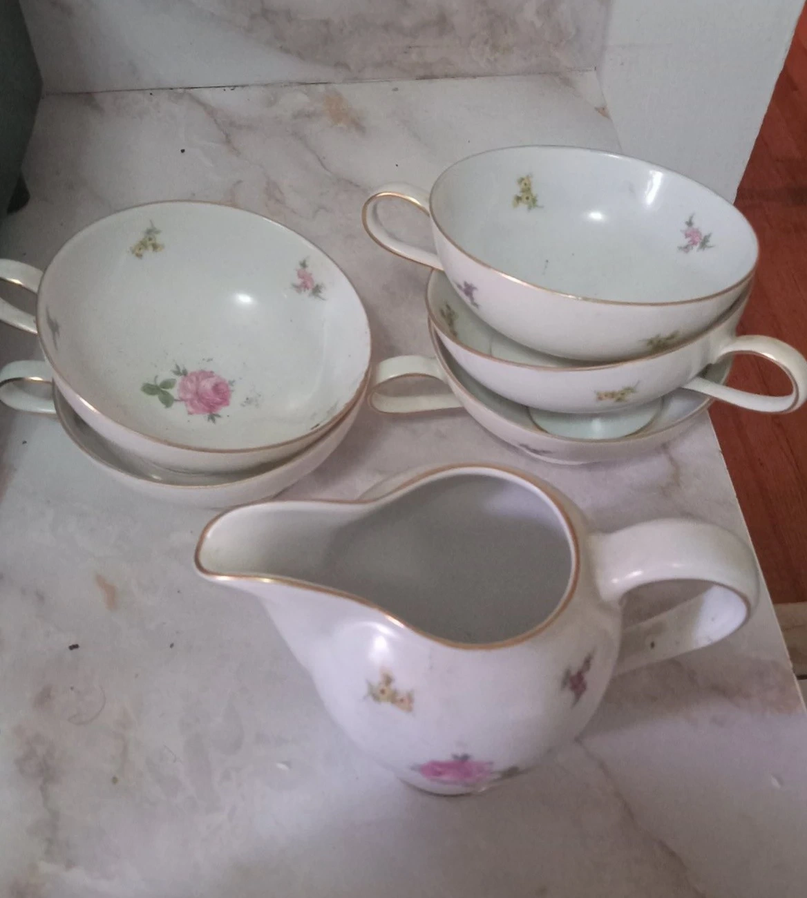 This set includes two vintage teacups with saucers and a matching creamer pitcher. Each piece is white porcelain with delicate floral transfers and a gold rim. The cups have classic loop handles.