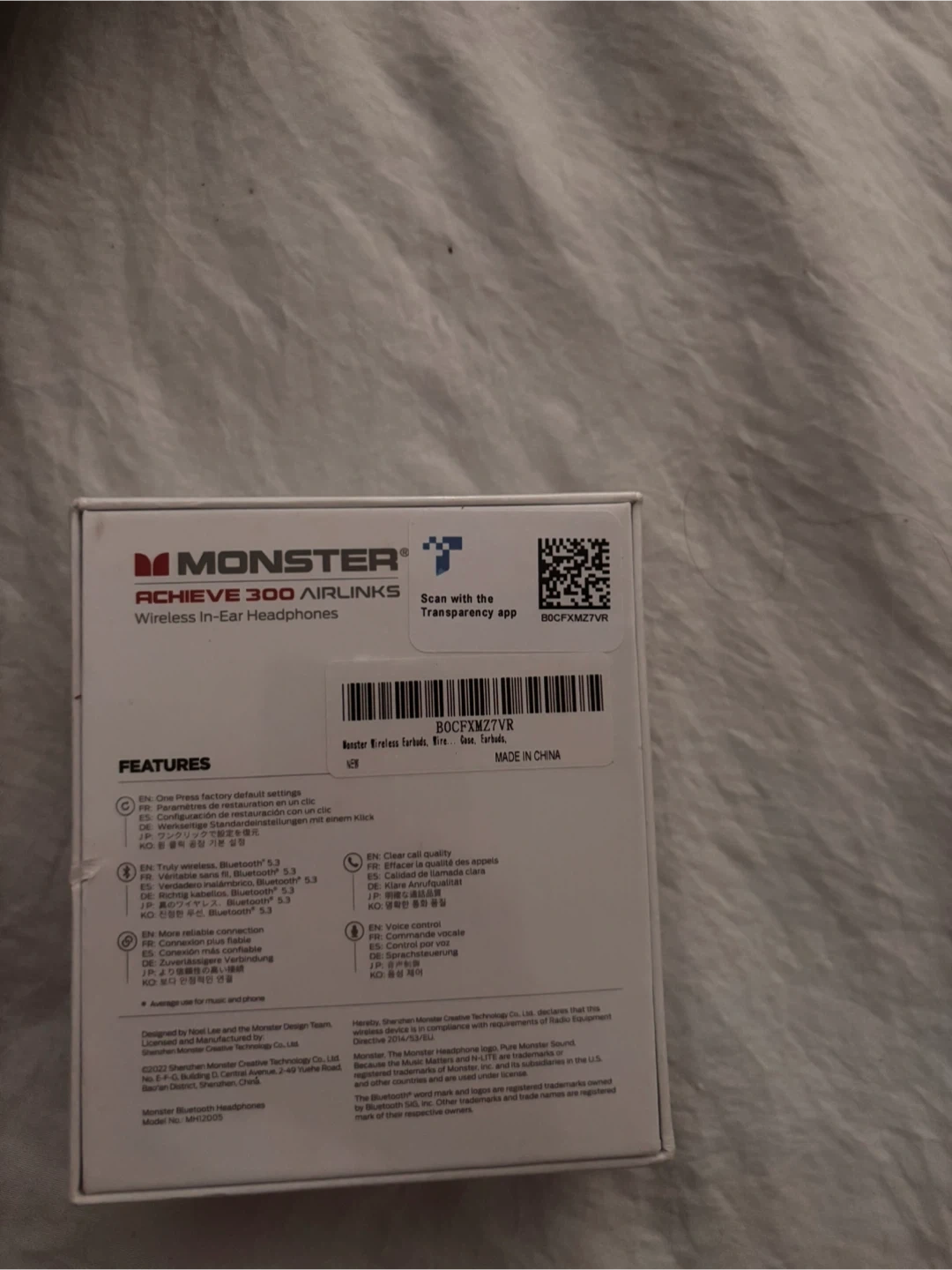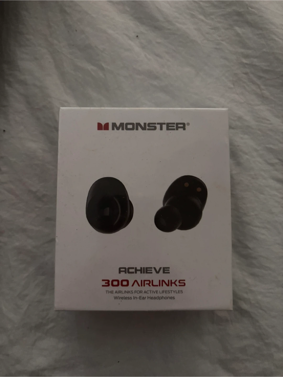 Monster Achieve 300 AIRLINKS wireless in-ear headphones. These earbuds feature pure Monster sound and Bluetooth 5.3 connectivity. They include a USB-C charger.