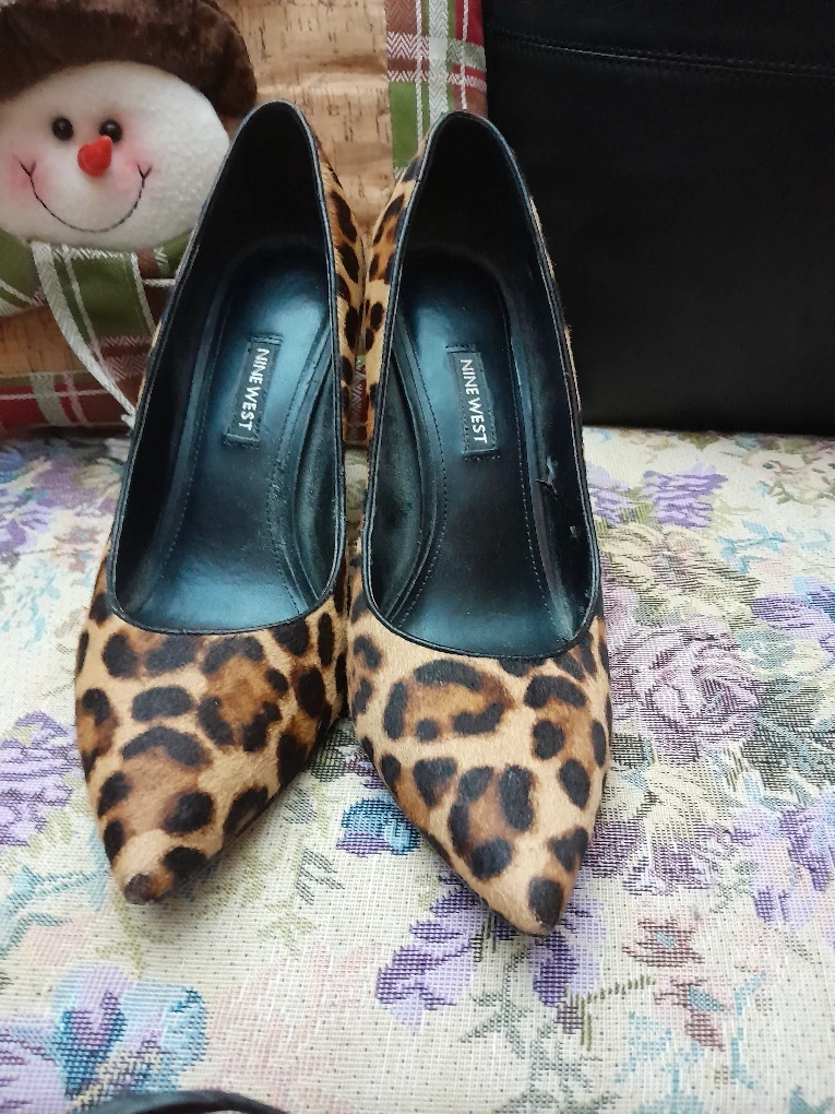 Selling a pair of Nine West heels in a fun leopard print! They're a size 8.5M. Please note that there is some wear and tear inside the shoe as shown in the photos but foundation is still good.