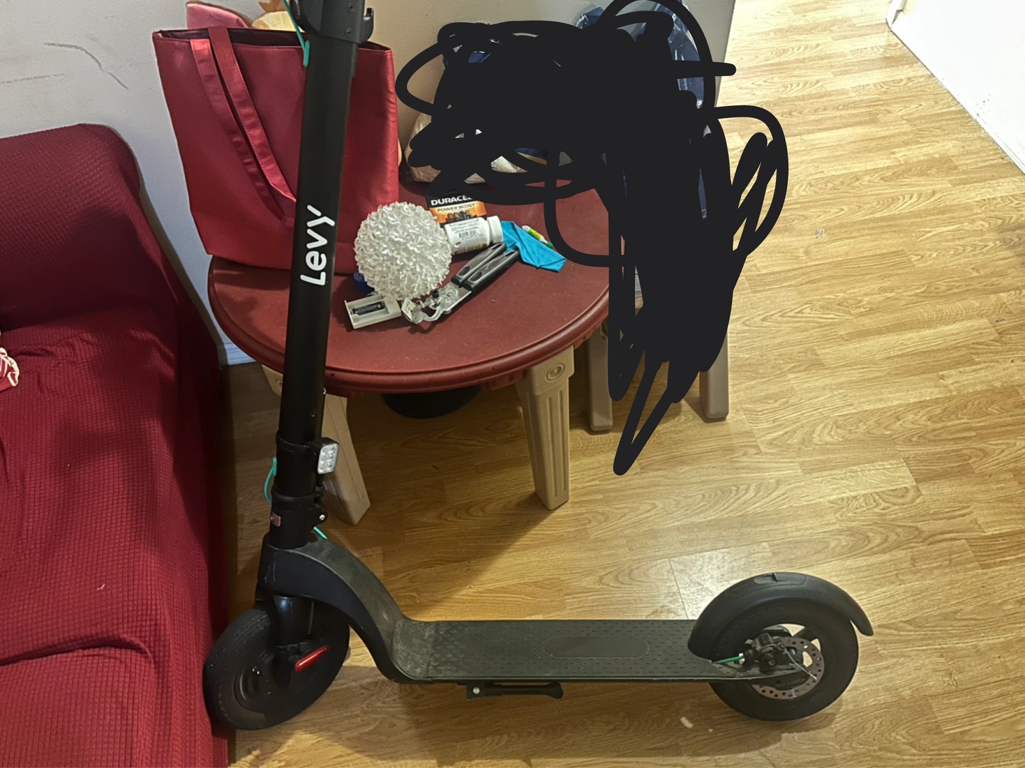 This is a Levy electric scooter. It's black and foldable. Great for getting around, charger included, pls buy me i need money🙏