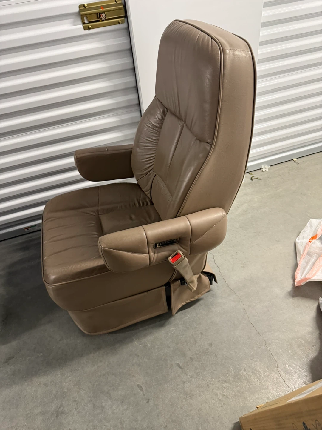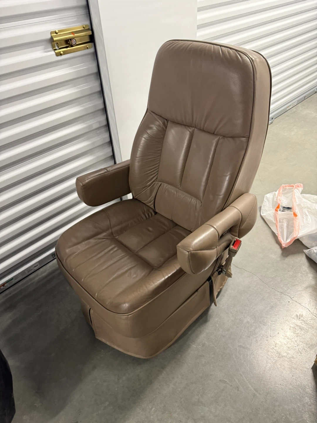 This is a comfortable brown leather captain's chair seat. It features adjustable armrests and a built-in seatbelt. The seat is upholstered in a durable leather material. It's suitable for RVs, vans, or as an office chair.