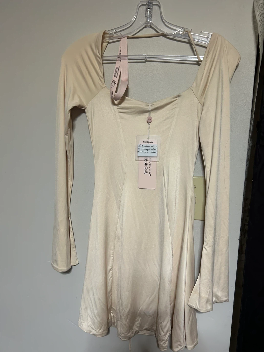 This is a champagne-coloured satin mini dress by OH POLLY. It features long, flared sleeves and a sweetheart neckline. The dress is made from a smooth satin material. It's perfect for a night out or a special occasion!