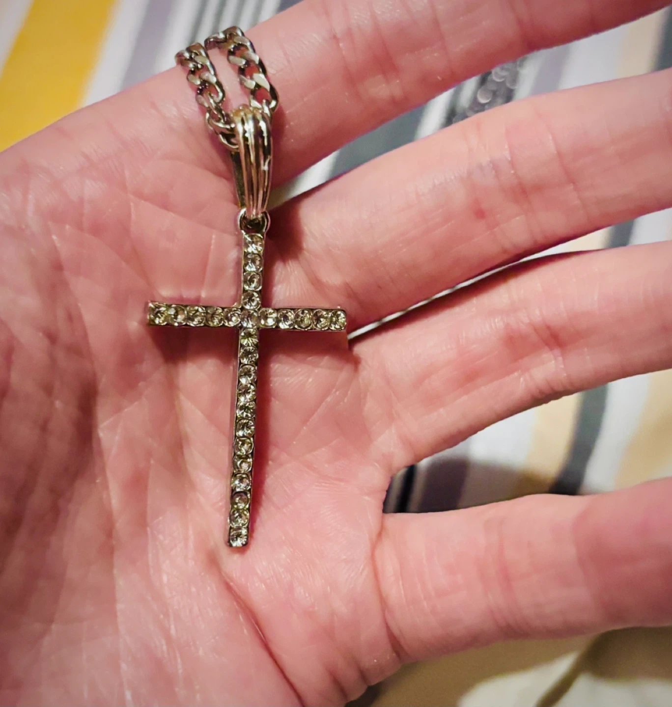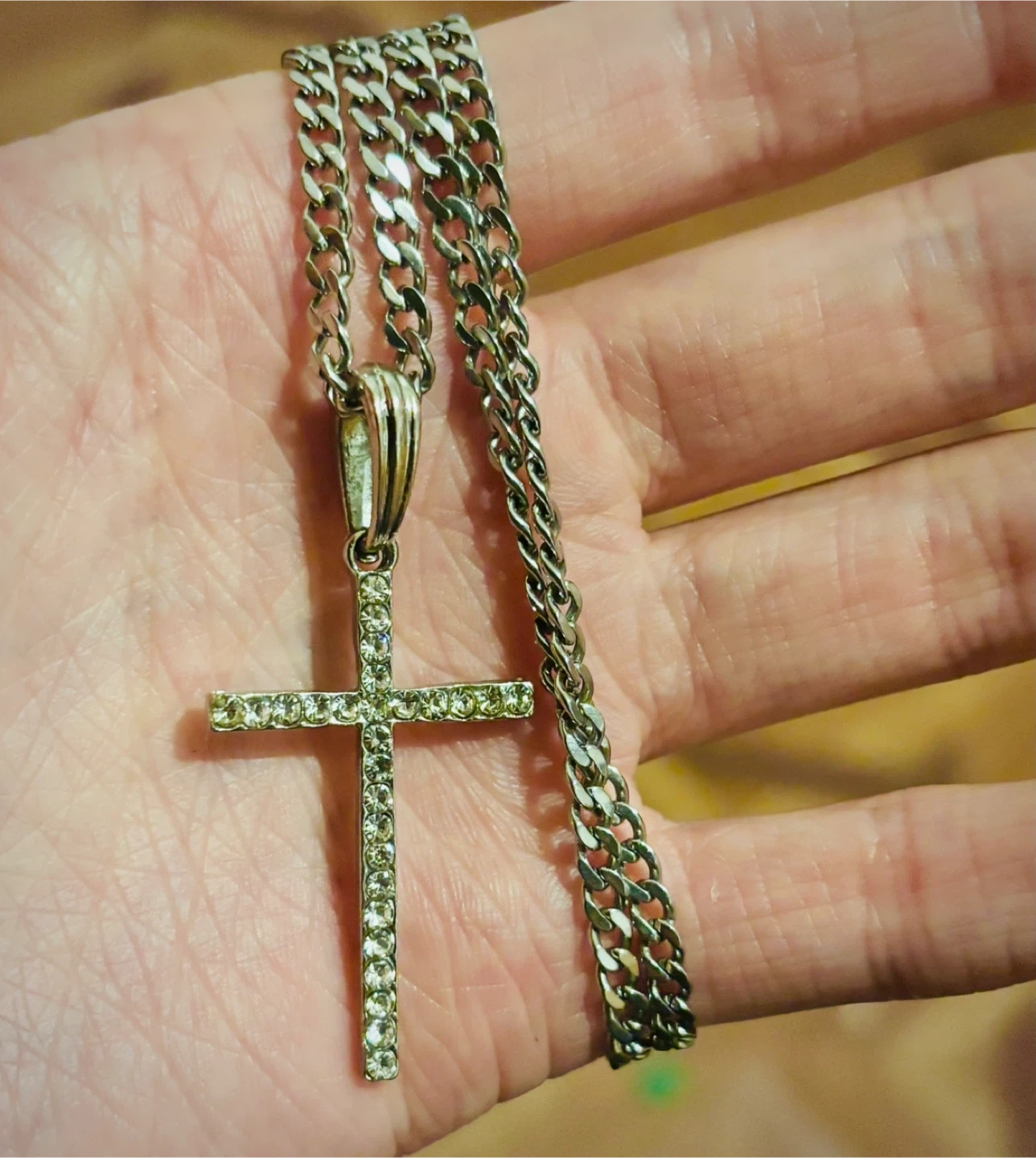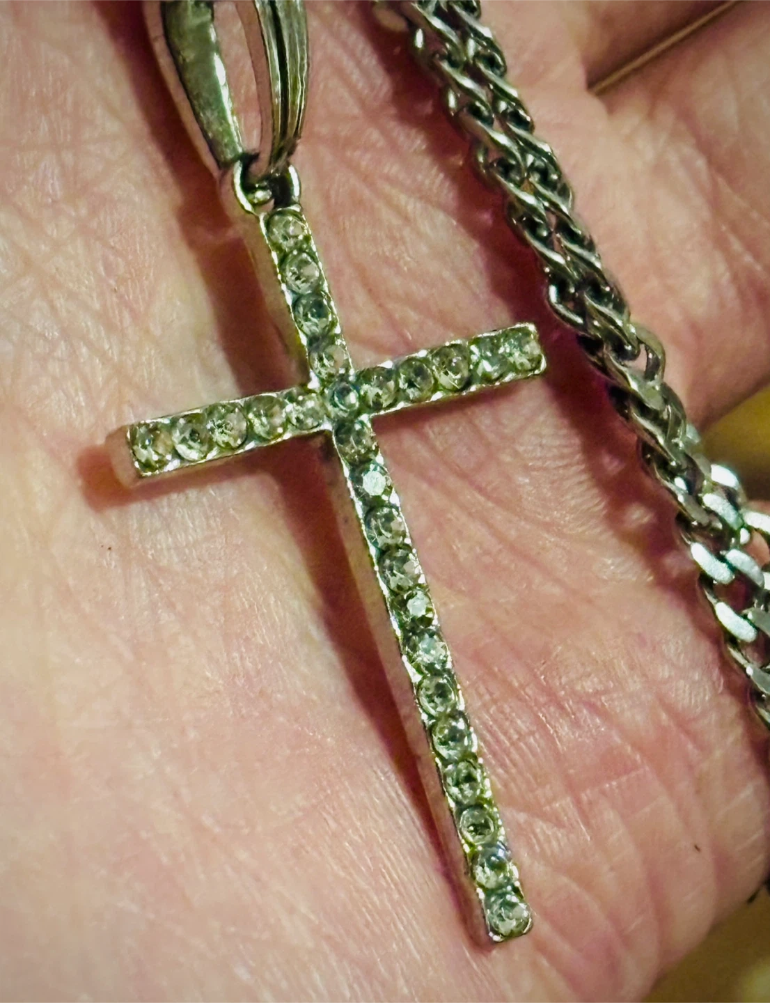 This cross pendant necklace features a chain with a curb link design. The cross pendant is adorned with clear rhinestones. It's made of stainless steel. The pendant has a polished silver-tone finish. Accepting only cash as of right now.