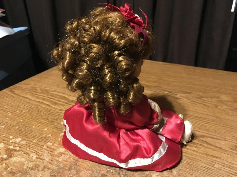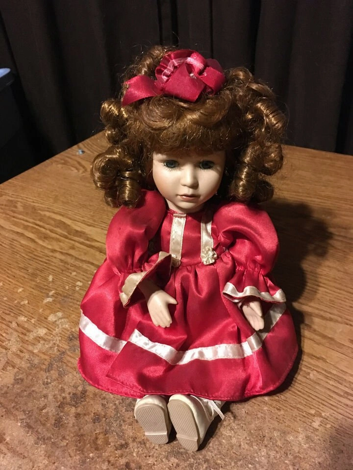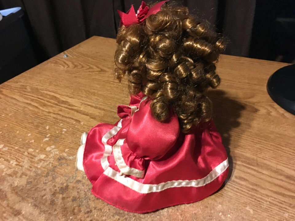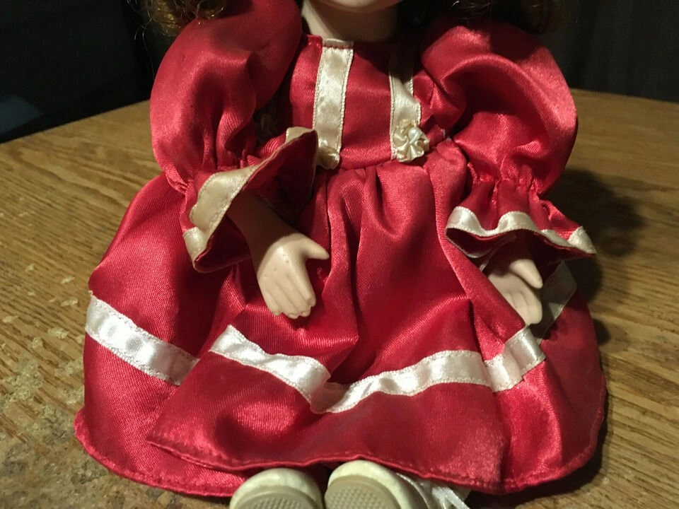 Adorable vintage porcelain doll. Red satin dress with white trim. Curly brown hair and a bow. Wind-up mechanism. Made in China. Not recommended for children under 8 years old. in great condition tested working. pick up at home