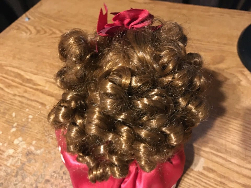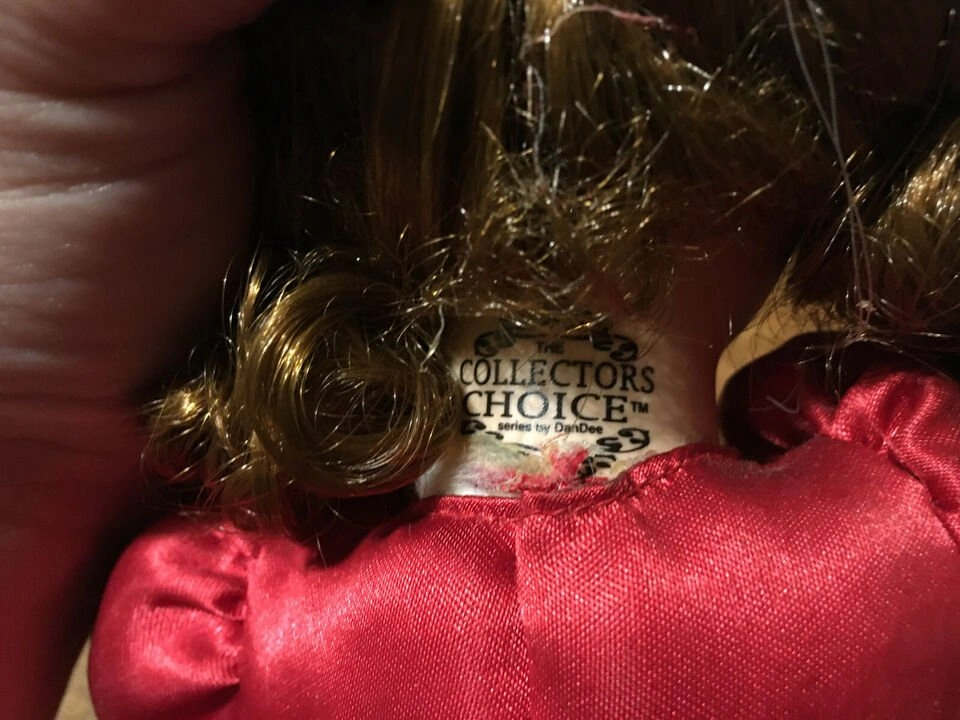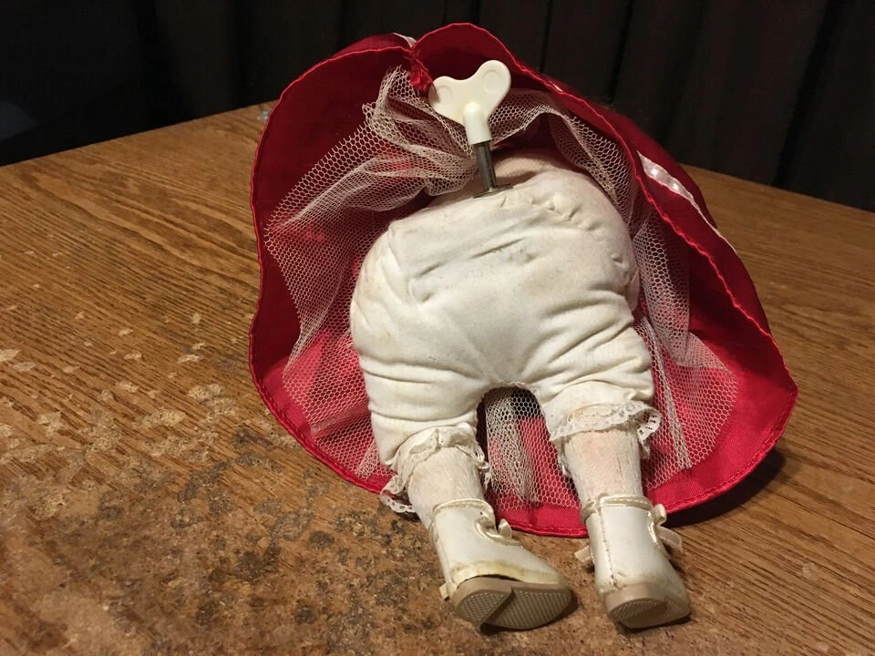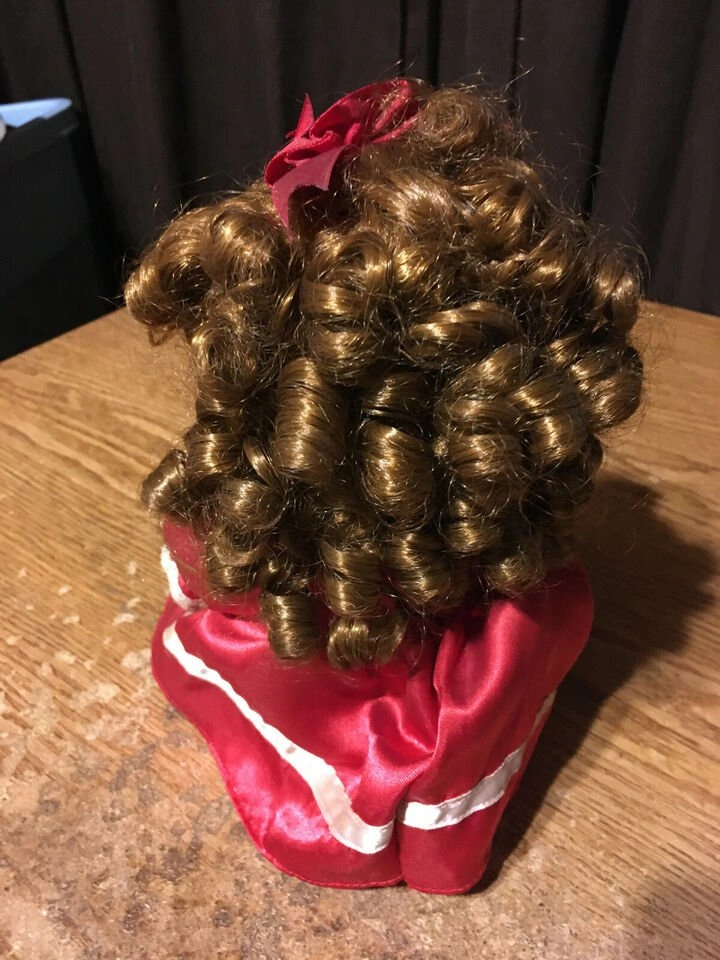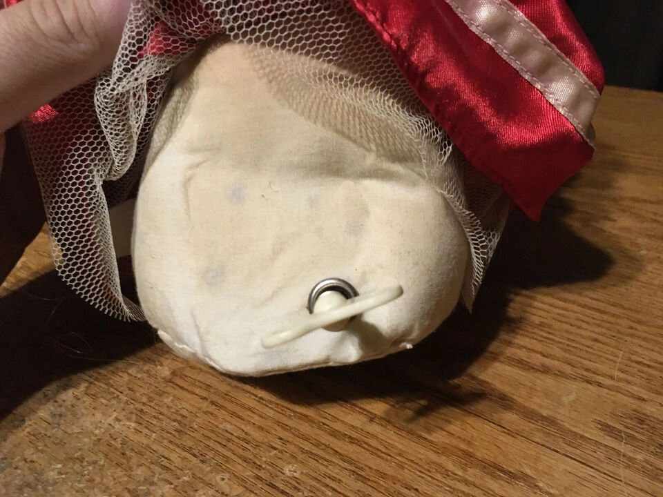Adorable vintage porcelain doll. Red satin dress with white trim. Curly brown hair and a bow. Wind-up mechanism. Made in China. Not recommended for children under 8 years old. in great condition tested working. pick up at home