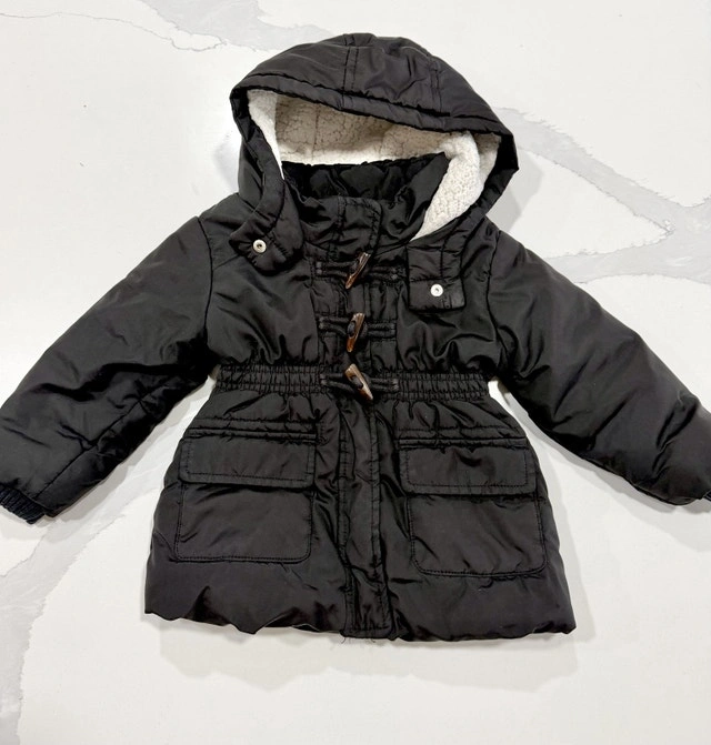 Keep your little one snug with this gently used Kids black winter coat, designed for toddlers size 2T. This stylish and functional coat features a cozy, sherpa-lined hood, toggle closures, and handy front pockets. It's in good condition, ready to provide warmth and comfort through the colder months. Specifications: