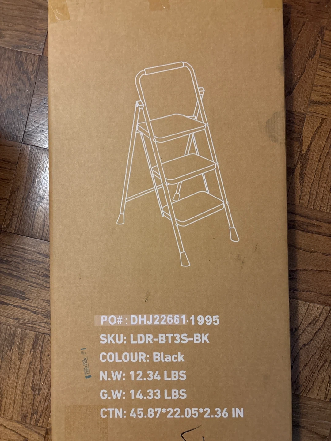 30Selling a BRAND NEW black 3-step ladder. The box indicates the net weight is 12.34 lbs and the gross weight is 14.33 lbs. The carton dimensions are 45.87 x 22.05 x 2.36 inches. Box never opened