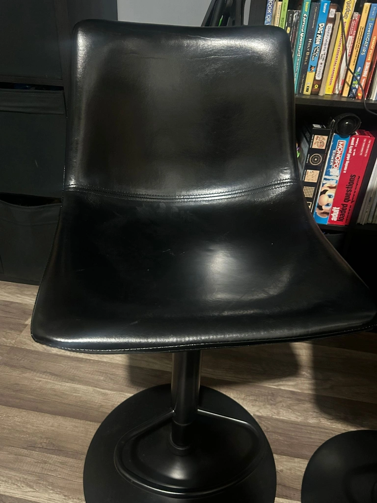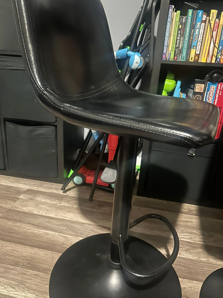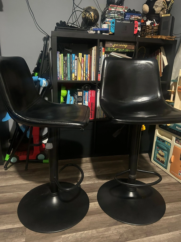 10Selling a set of two black adjustable bar stools! They're in great shape and would look great in any kitchen or bar area. The height is adjustable, so you can customize them to fit your needs. They have a sleek, modern look!