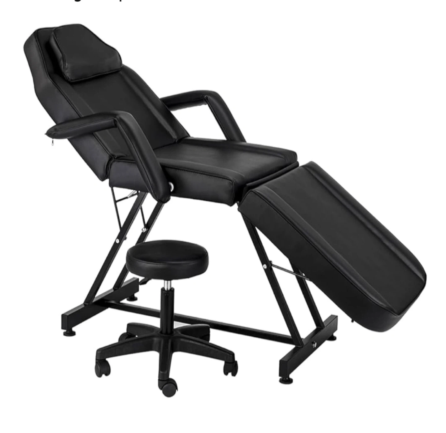 Selling a black adjustable facial, tattoo bed that comes with a stool. In good condition and ready for use in your salon or spa or tattoo parlor.