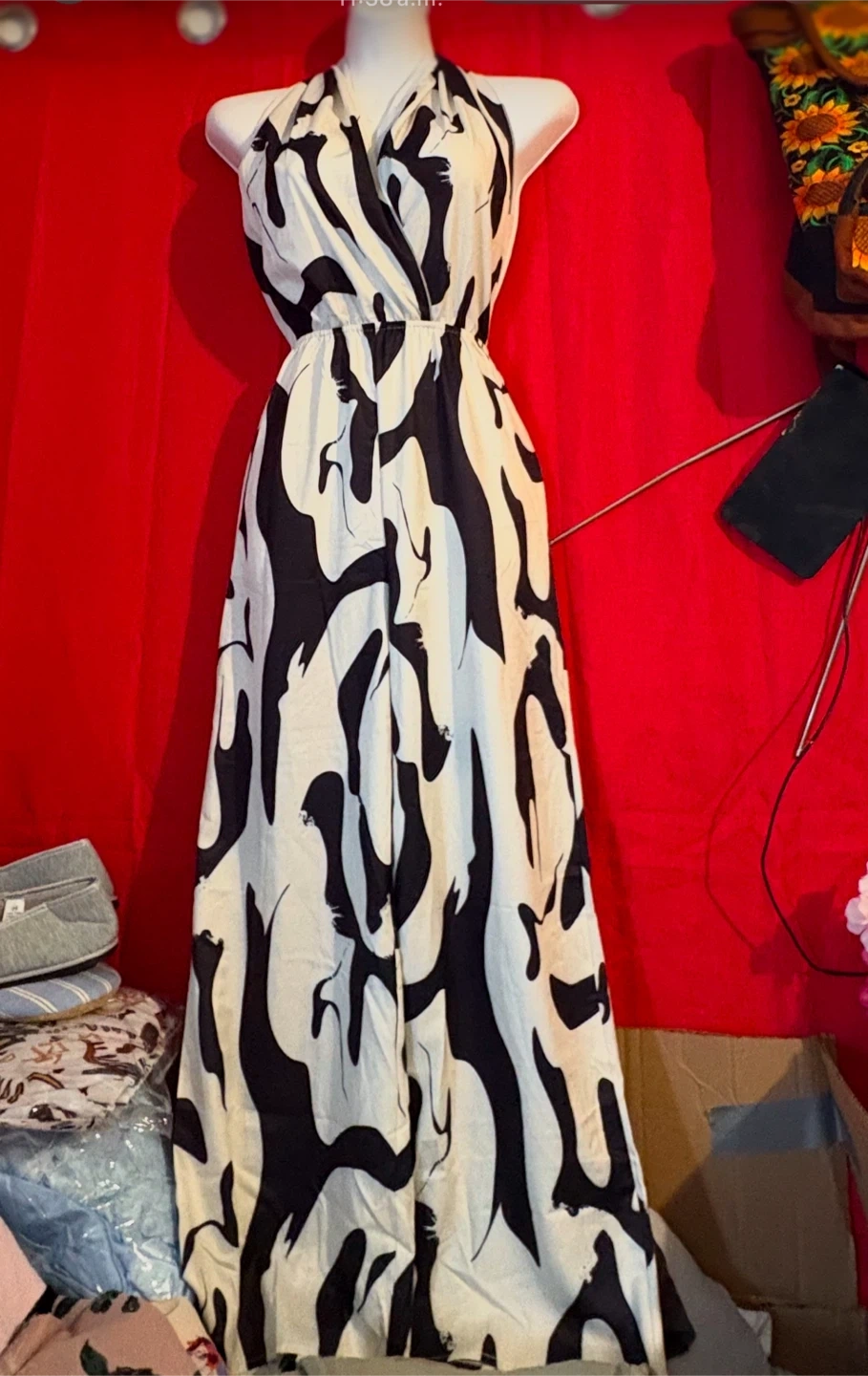 Selling a stylish black and white halter maxi dress. It's a great piece for summer or a night out! The dress features a unique pattern and a flattering halter neckline