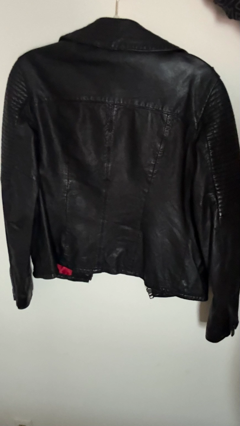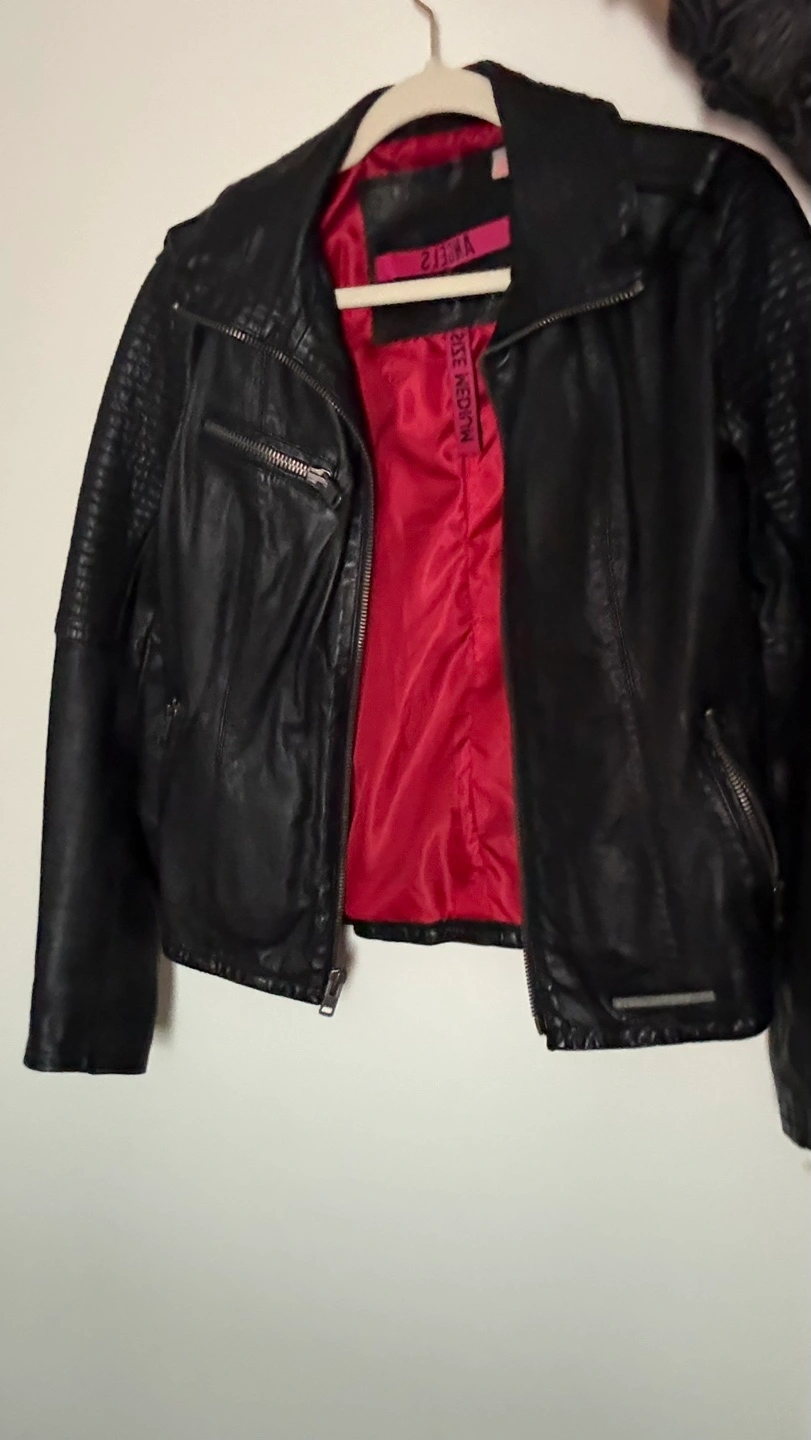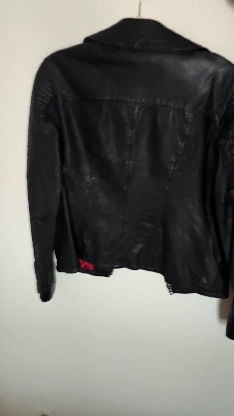 10Black leather jacket. Size Medium. Zipper closure. Pockets.