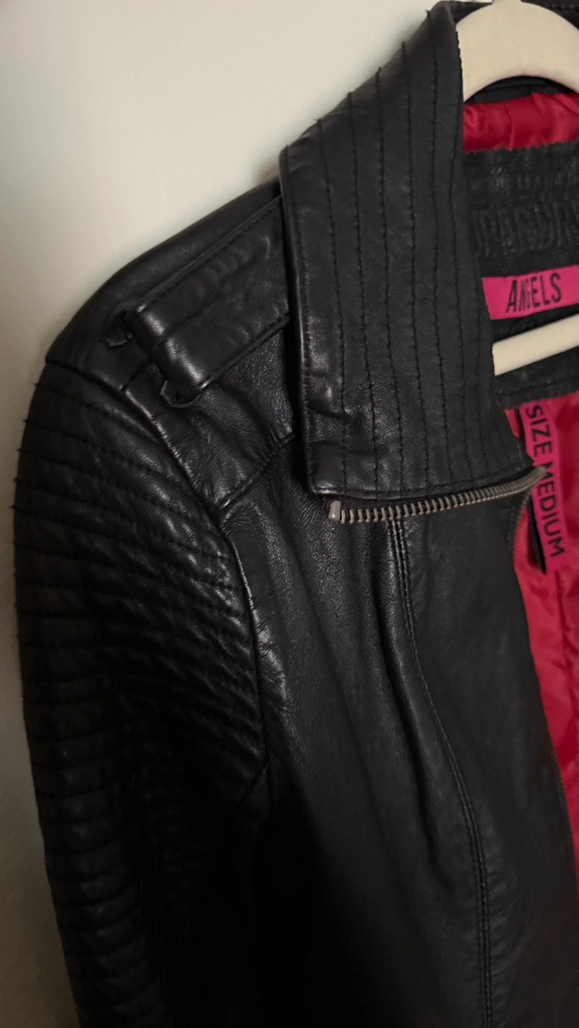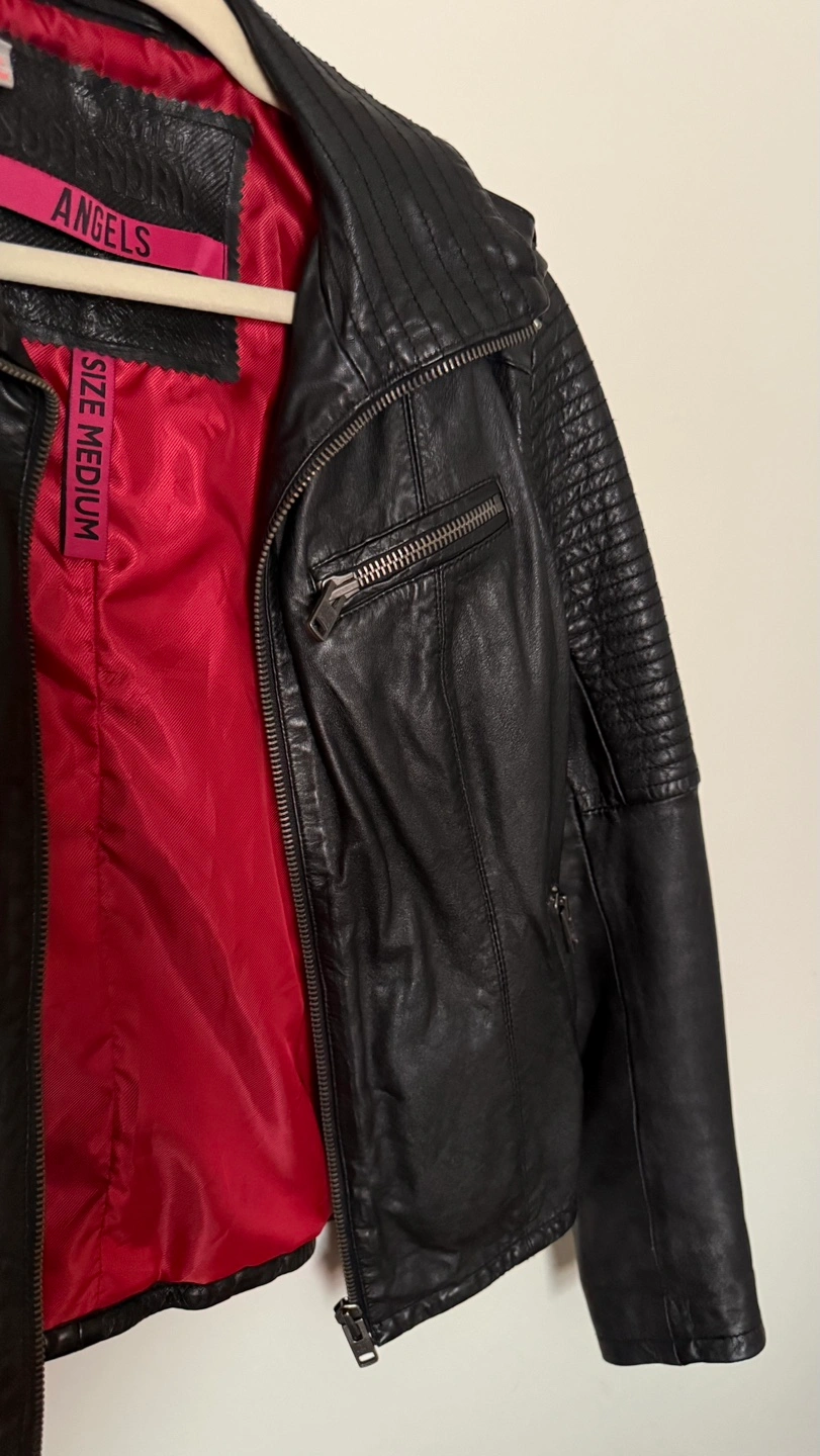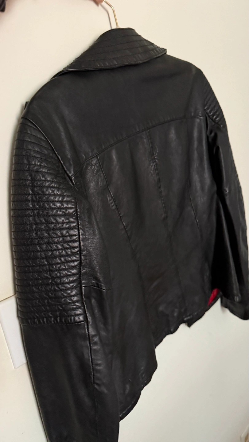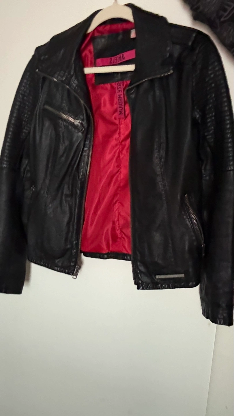 10Black leather jacket. Size Medium. Zipper closure. Pockets.