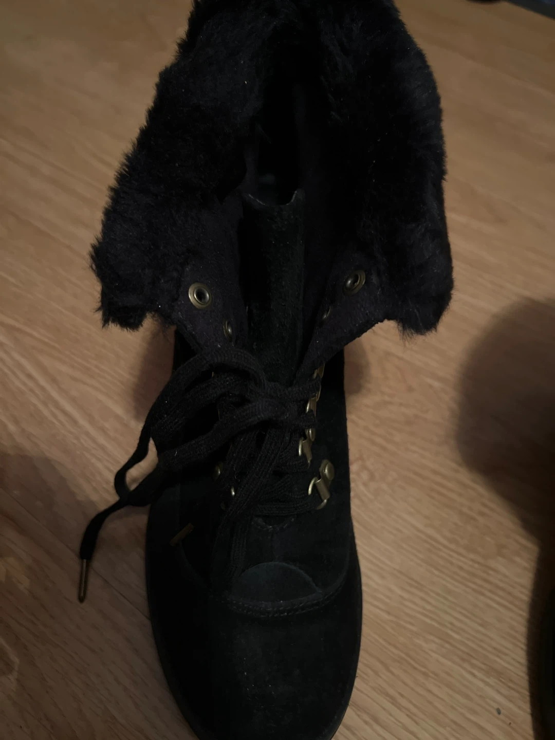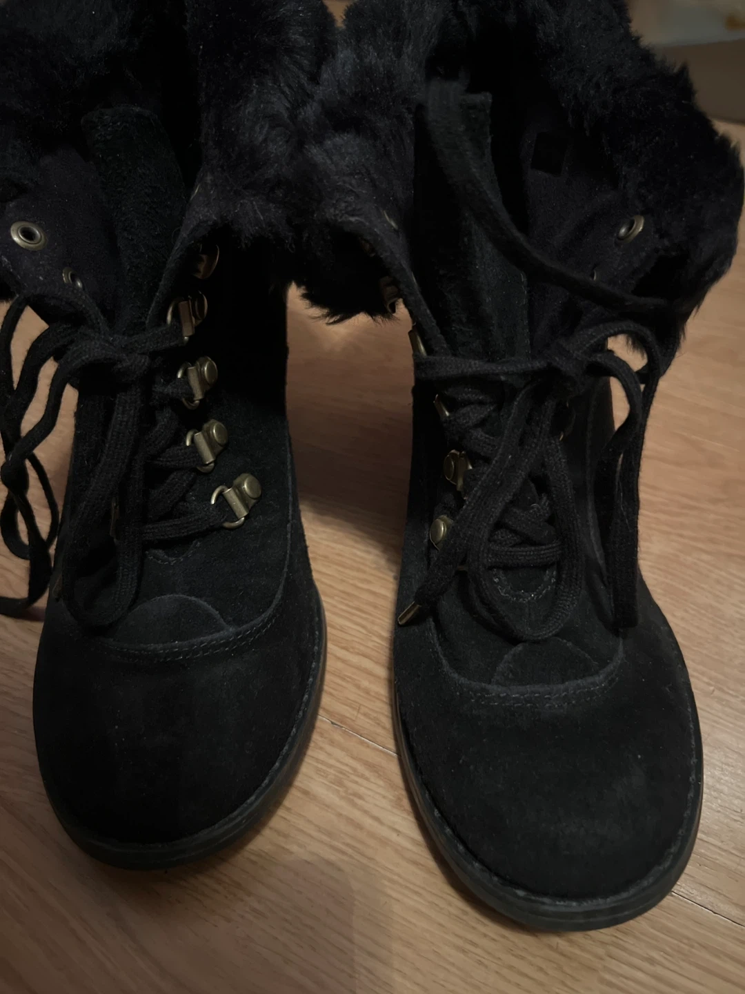 44These are cute black ankle boots with a faux fur trim! They're perfect for fall or winter. They have laces and a small heel of 3.5 inch.