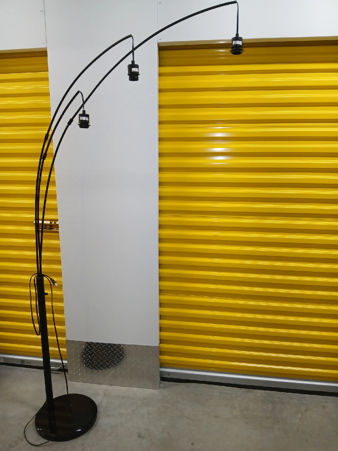 45Selling a black arc floor lamp. It has a black marble base and three curved arms that hold the light fixtures. Each fixture is designed for an E26 Max 40W bulb and operates on AC110-120V/60Hz
