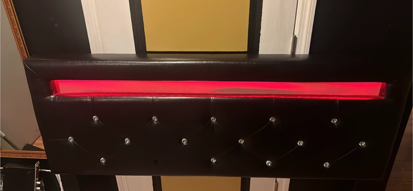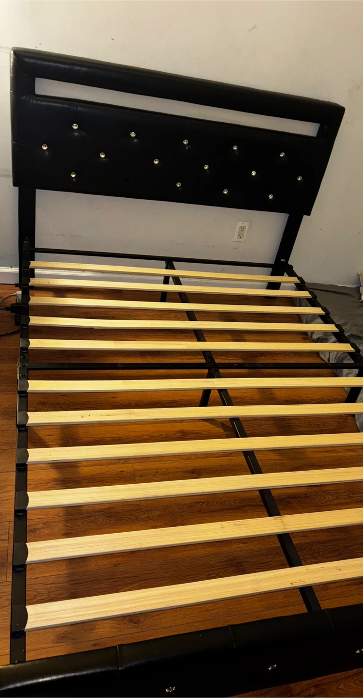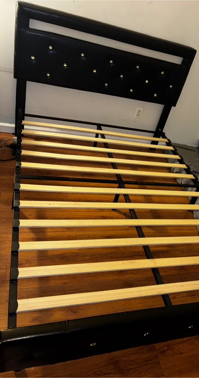 32Please note that 2 of the wooden slats is damaged and There is 1 missing rhinestones can easily be fixed with wood glue. Selling a black bed frame with a faux leather headboard. The headboard has embedded decorative rhinestones and an LED light strip.