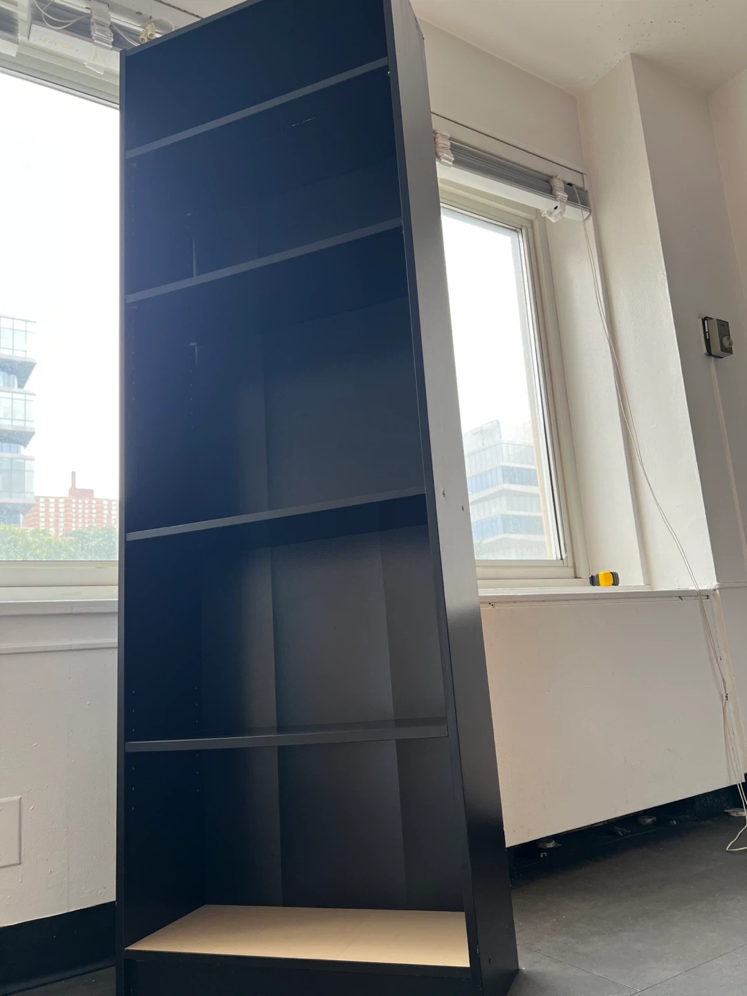 LEAVING NYC IN THE FALL 🥲 Selling off my apartment piece by piece so feel free to look through my listings and pick up some cool things for you and your friends 🏘️ Ask me any questions on measurements 📐 Selling a black bookshelf in good condition. It has multiple shelves for storage and display. The shelf measures about 22 inches in width.