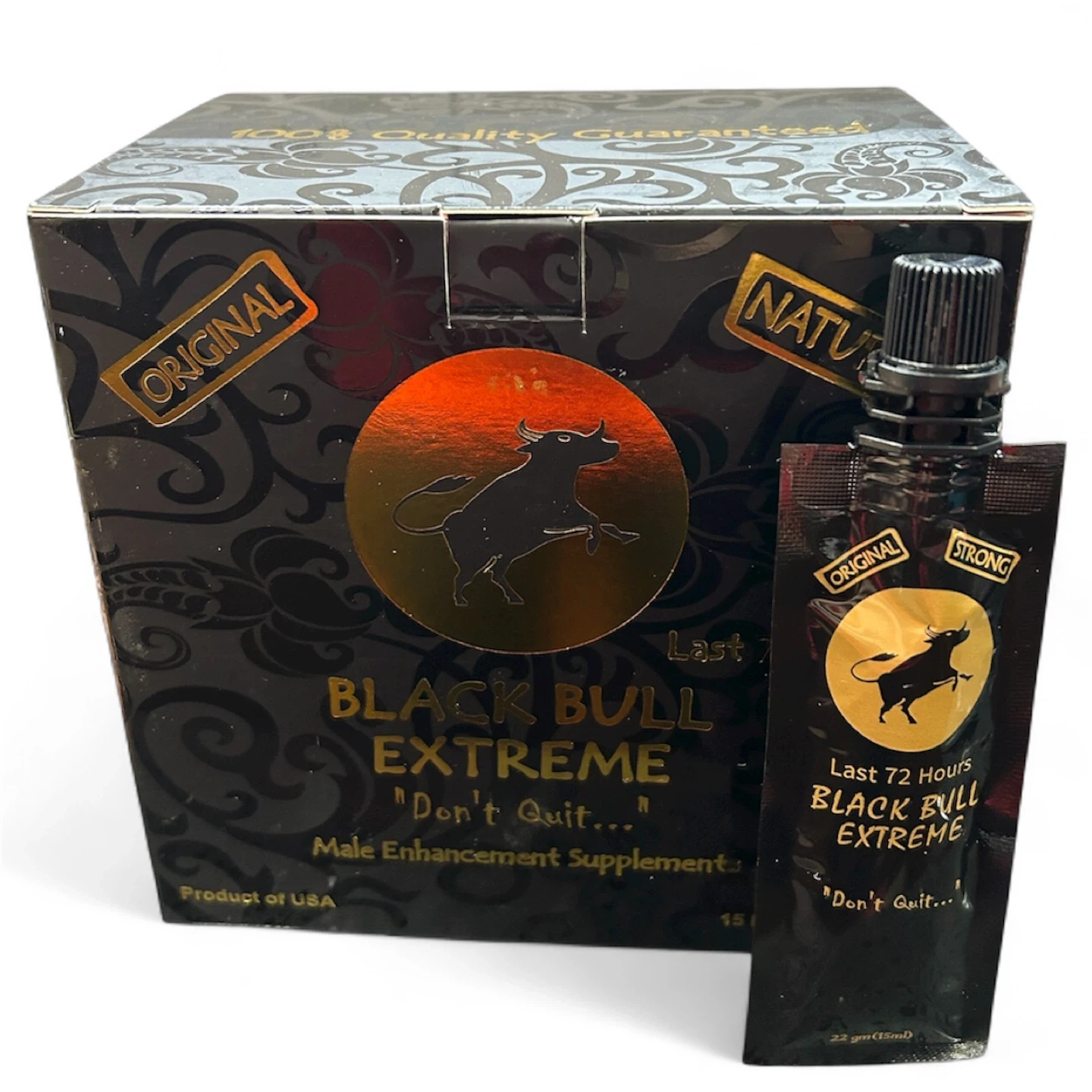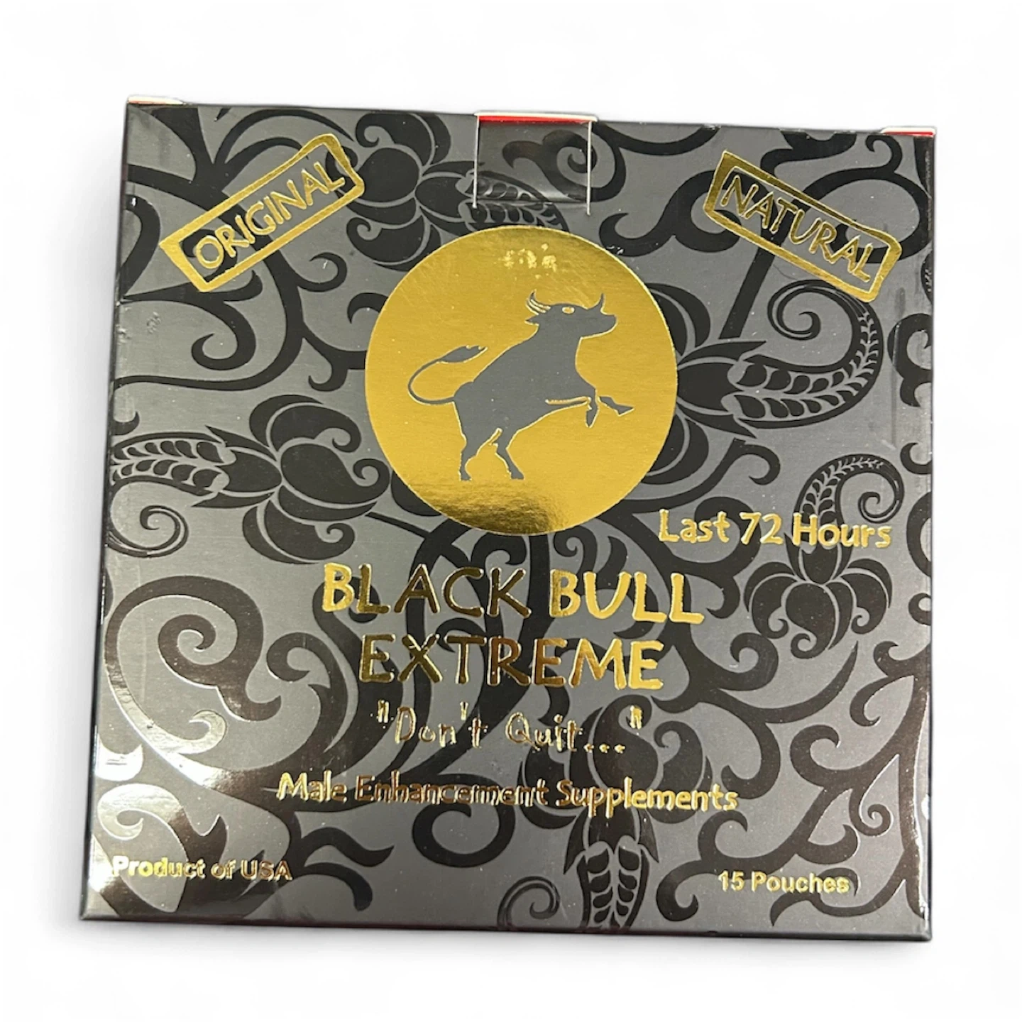 Selling a box of Black Bull Extreme male enhancement supplements. Each box contains 15 pouches. Expiration date is December 2030. Features include increased erection, increased sexual desire, and enhanced sexual performance