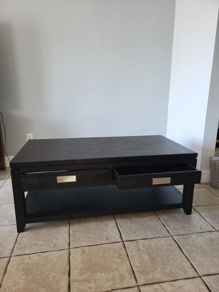 99Selling a black coffee table in good condition! It features two drawers and a lower shelf for storage. It's perfect for any living room setup.