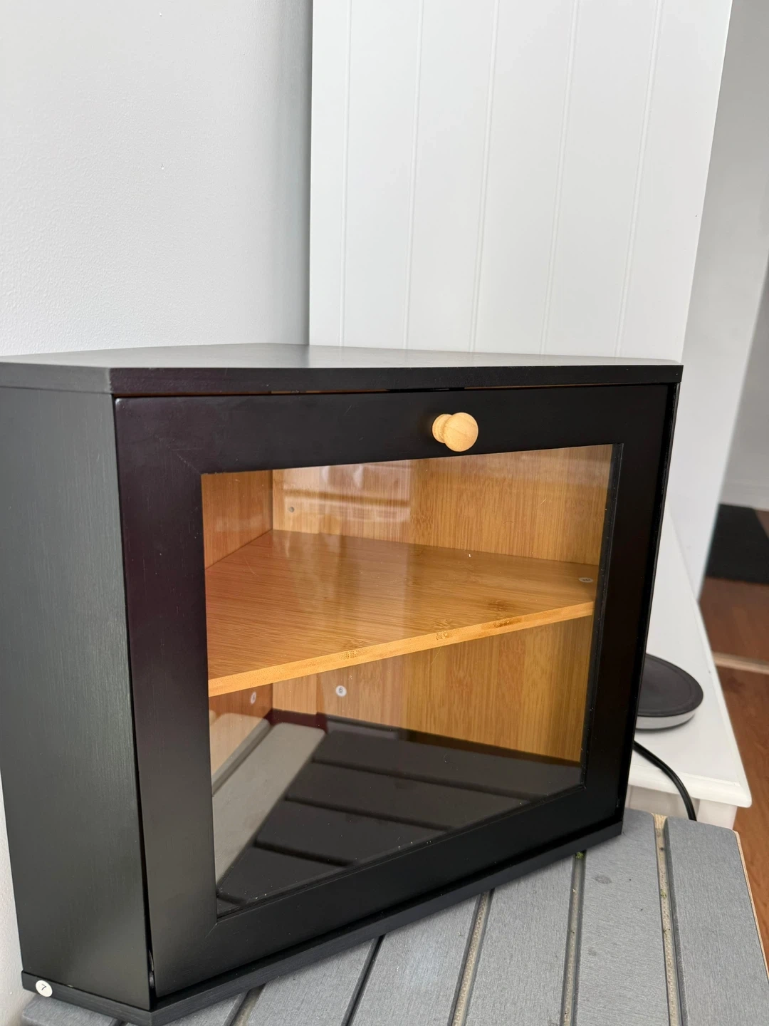 79Selling a stylish black corner cabinet! It features a glass door and a shelf inside. The dimensions are approximately 12.6 inches x 13.26 inches x 13.5 inches. Perfect for adding a touch of elegance and extra storage to any corner of your home