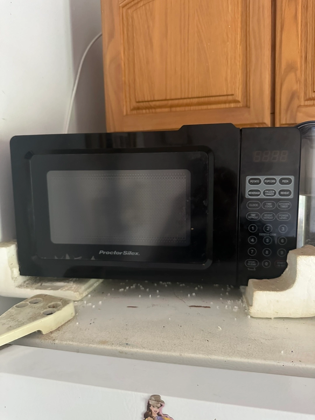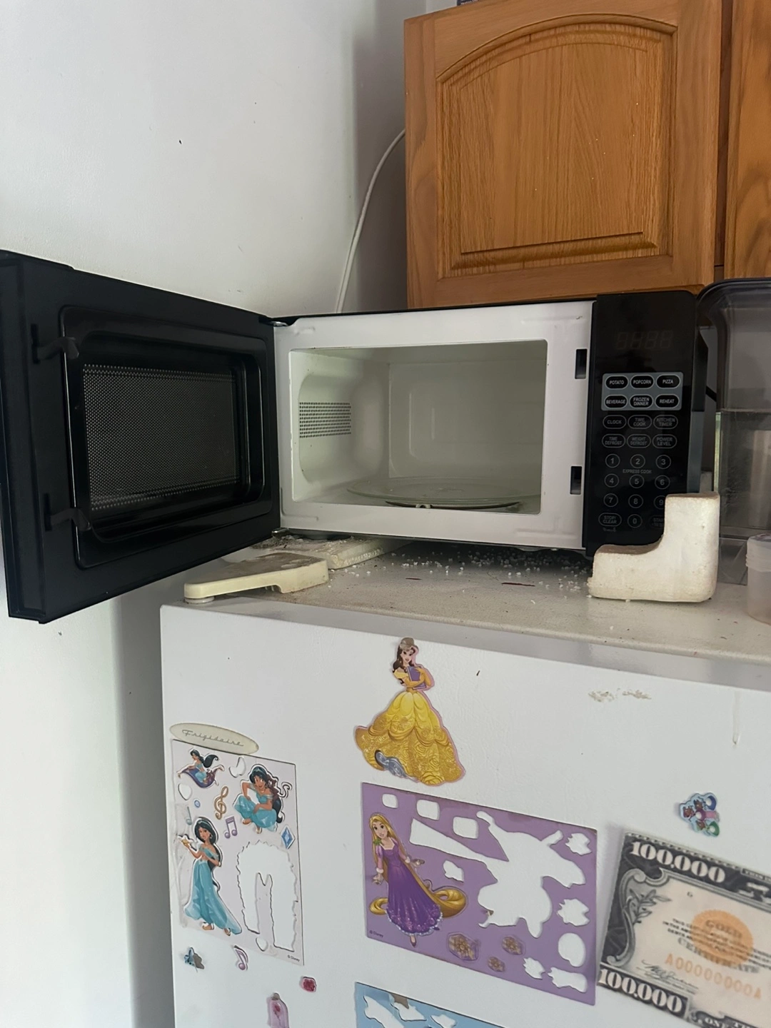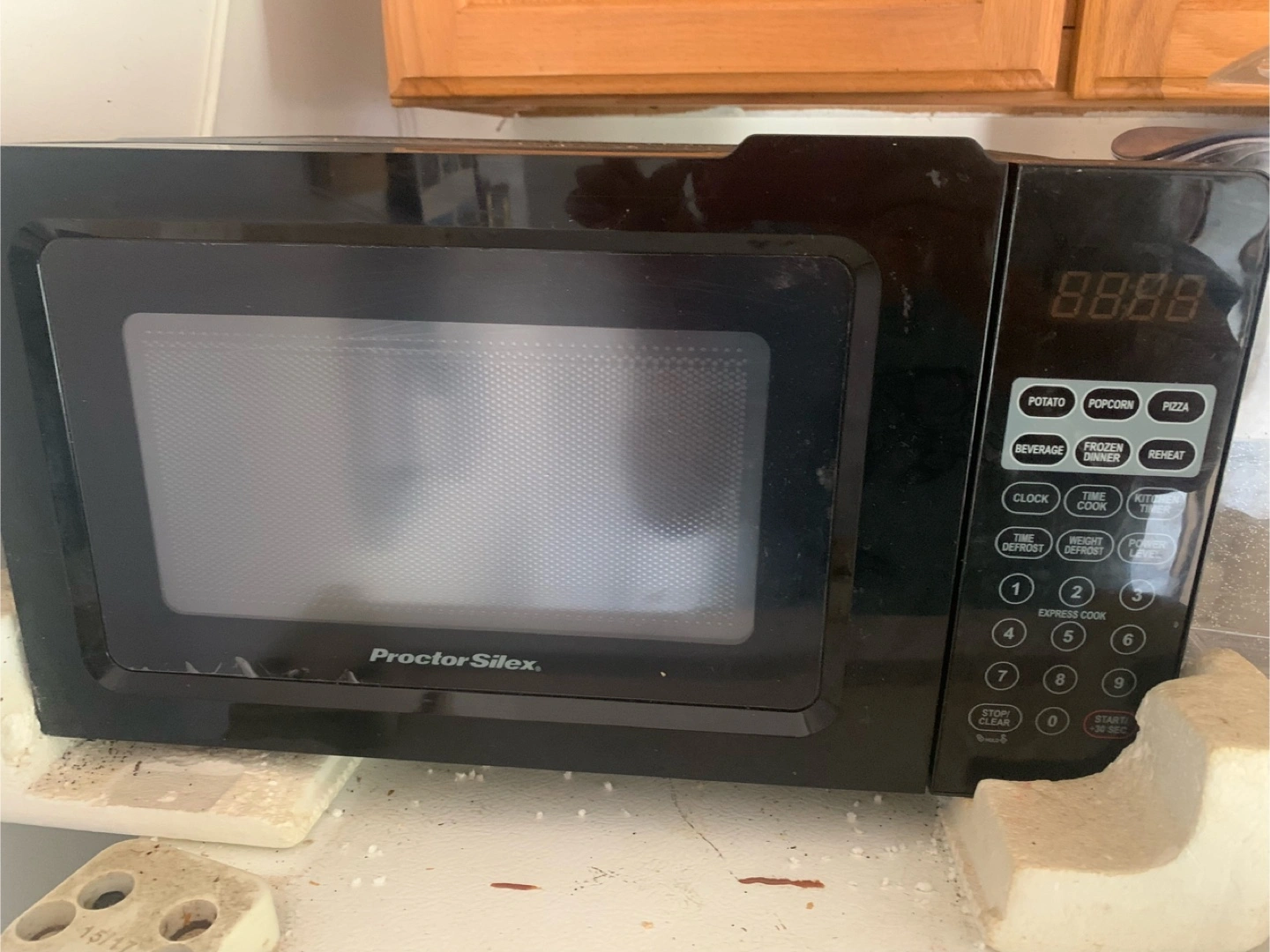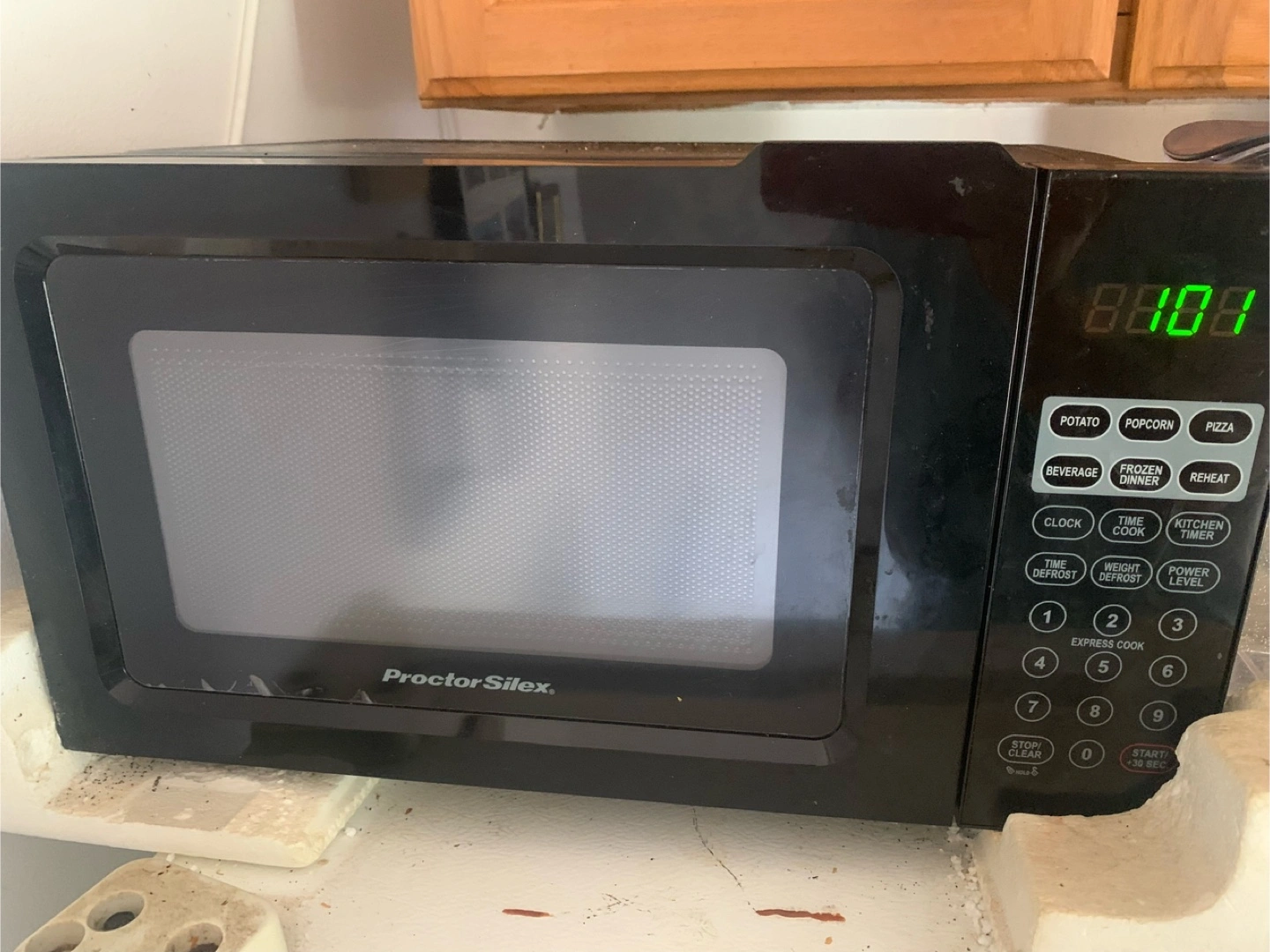 Selling a countertop microwave. It has a black exterior and a white interior. Perfect for quick meals and reheating leftovers! It's in used condition and could use a wipe down.