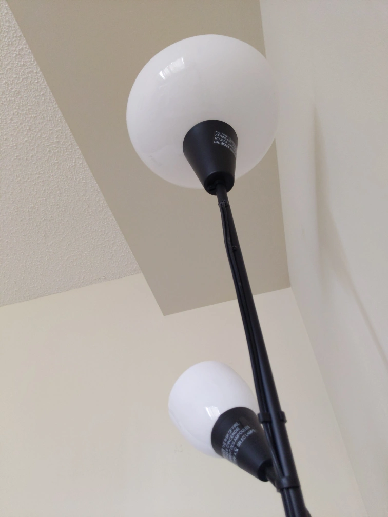 55A black floor lamp with two white shades. This lamp is approximately 6 feet tall.