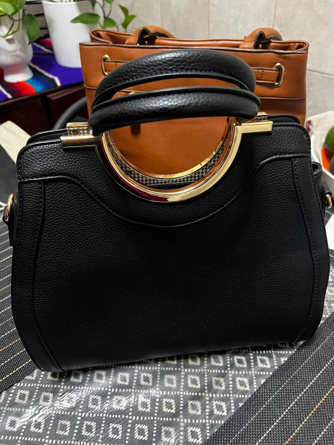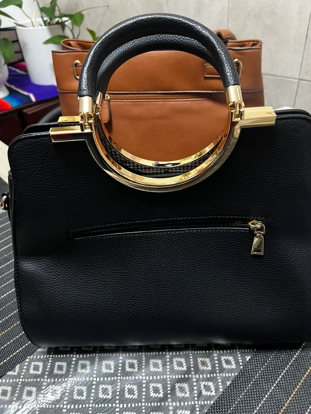20Stylish black handbag featuring elegant gold accents and a unique circular handle design. It's in great condition and ready for a new home! Perfect for adding a touch of sophistication to any outfit