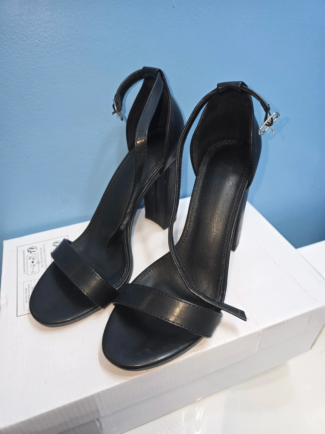 65These are a pair of stylish black heeled sandals. They feature an ankle strap and a block heel. Perfect for dressing up or down!
