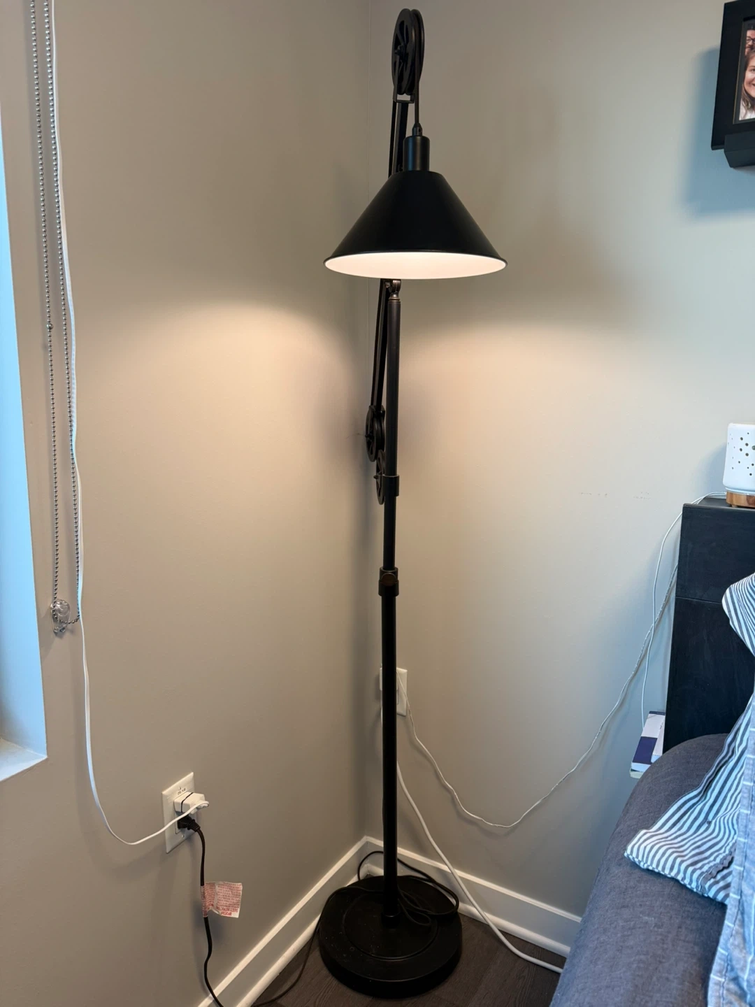 60Selling a stylish black industrial pulley floor lamp! It adds a unique touch to any room with its distinctive pulley design and sleek black finish. Perfect for adding some light to your space * Industrial Style: The steampunk-esque combined pulley system design and black finish make this floor lamp a unique indoor décor in the living room, bedroom, entrance, or office. * Adjustable Lampshade: You can use the pulley wheel system to adjust the living room lamp up and down to get the right amount of light you need. * Steel Frame: The steel frame makes this standing lamp strong and easy to clean off any dust or mess. * Easy to Use: A rotary switch is placed on top of the lampshade to easily switch it on and off and comes with a 6.2' long power cable for convenient plug accessibility. Bulb Types: LED, halogen, and incandescent. * Reading Lamp Information: Overall Dimensions: 36.5" L x 13" W x 70" H. Fits most bulbs with E26 base (bulb not included).
