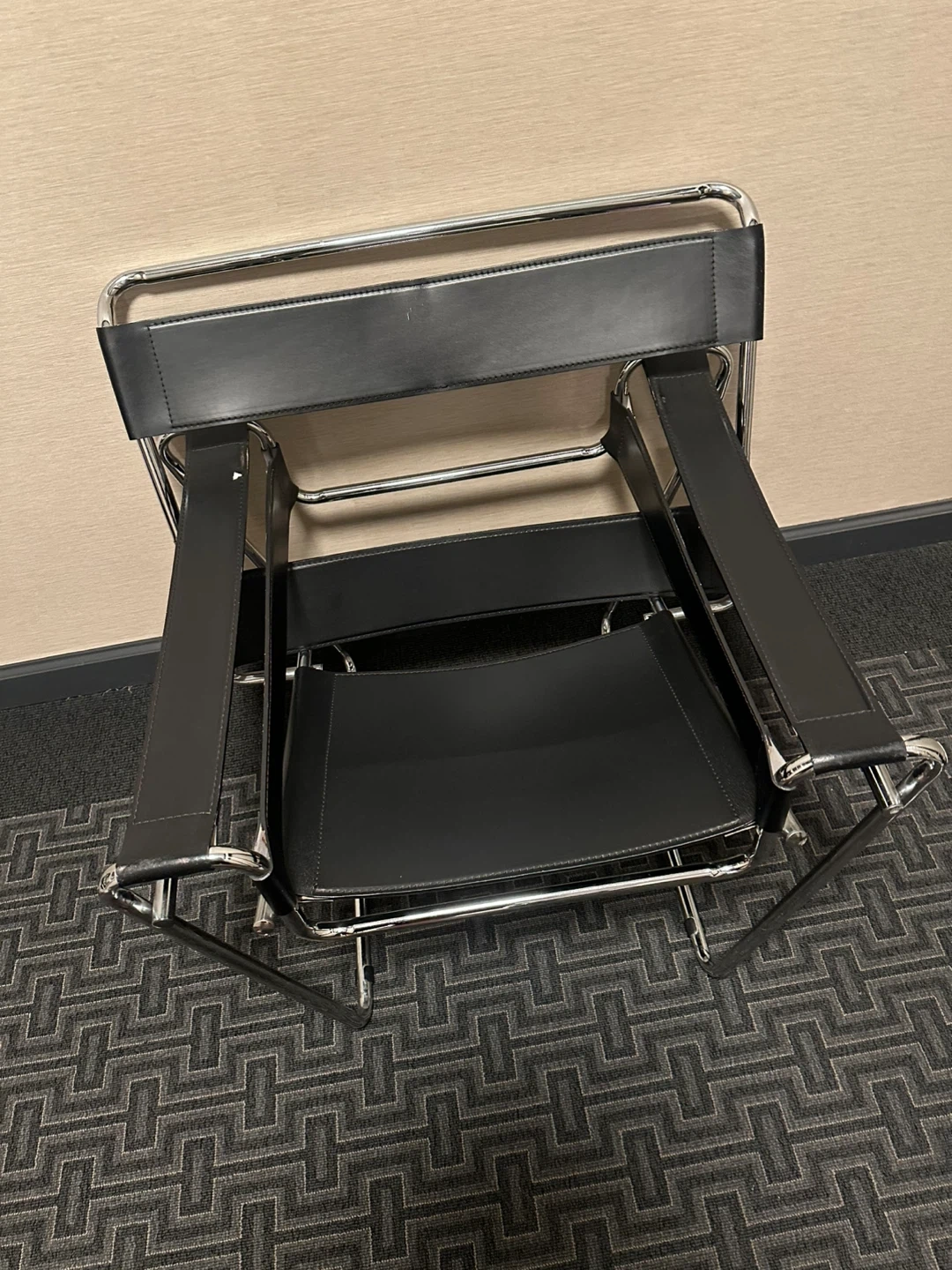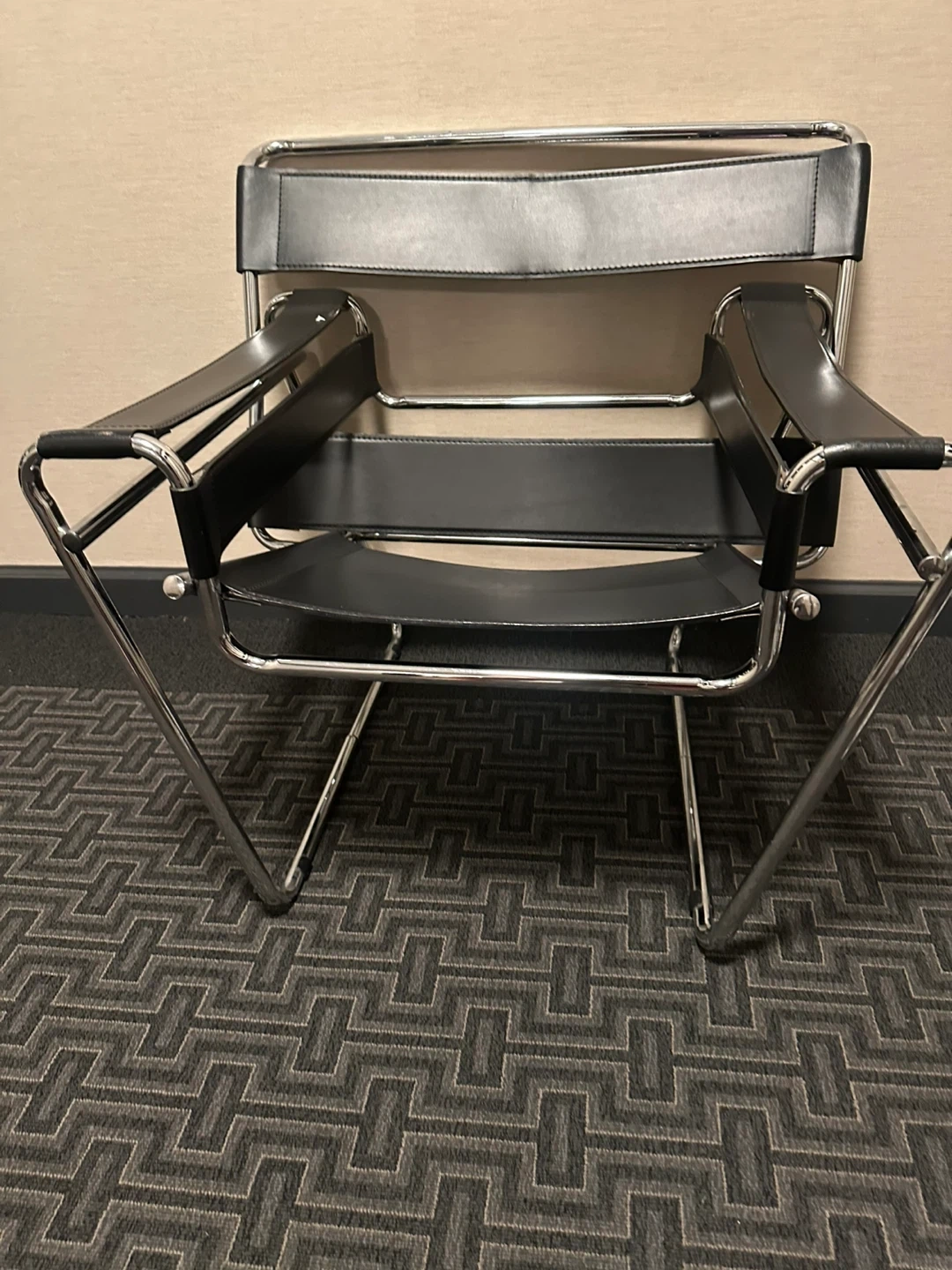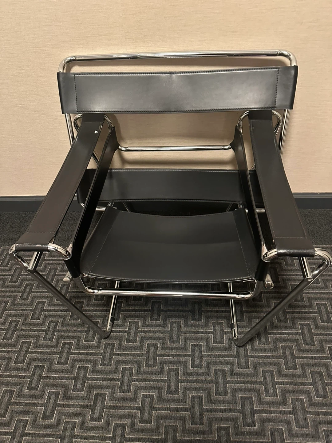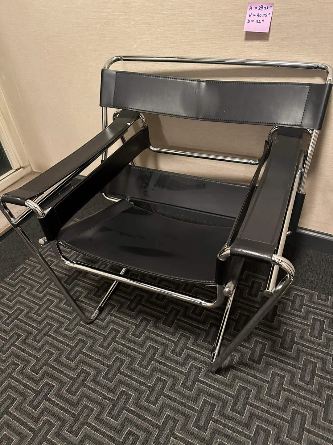Selling a classic black leather Wassily chair! It features a sleek, minimalist design with a chrome frame and black leather seat and back. The chair is in good condition and would make a stylish addition to any room. Approximate dimensions are H = 29.75", W = 30.75", and D = 26".