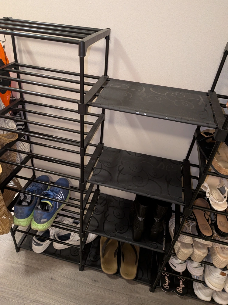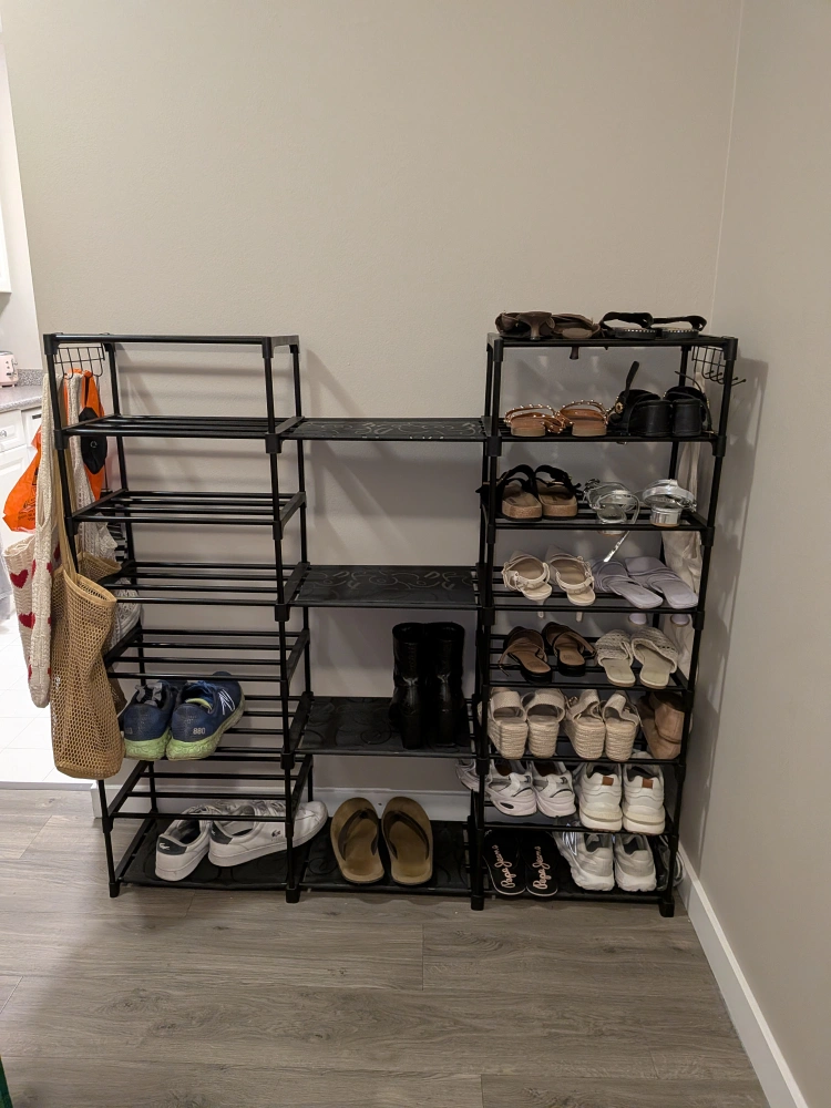 This is a black metal shoe rack organizer. It has multiple shelves for storing shoes and other items. It's in good condition and ready to organize your space!