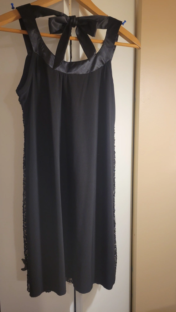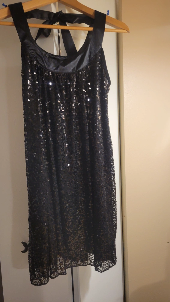 Selling athis gorgeous black sequin dress. It features a satin neckline and back tie detail. The front is all black sequins . Perfect for a date night or special occasion!
