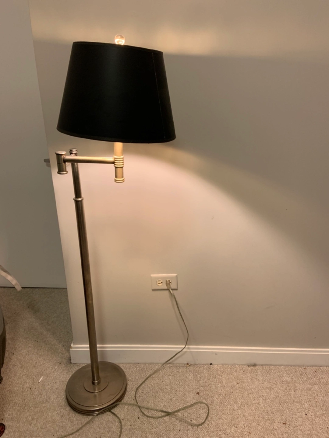 Selling a floor lamp with a black shade. It's in good condition and would be a great addition to any room. The lamp has a sturdy base and a sleek design
