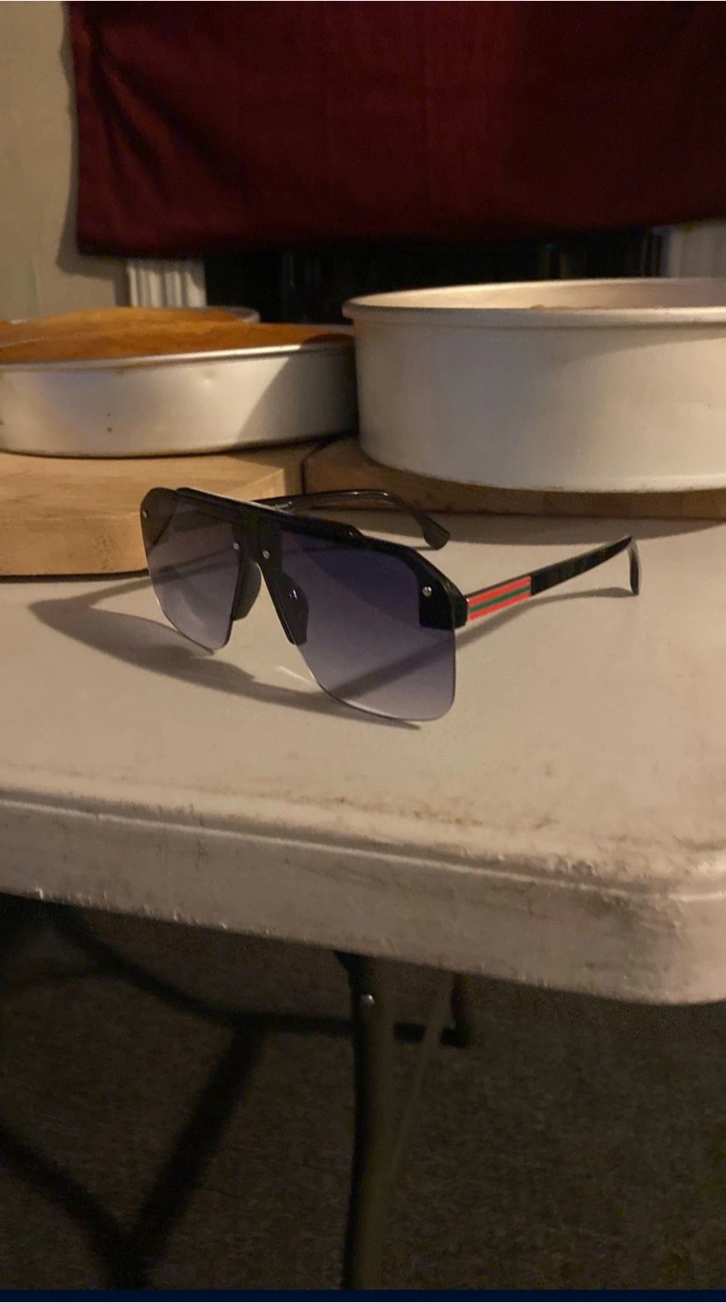 Selling a pair of black shield sunglasses. They have a unique design with a red and green stripe on the side. Stylish and in good condition!
