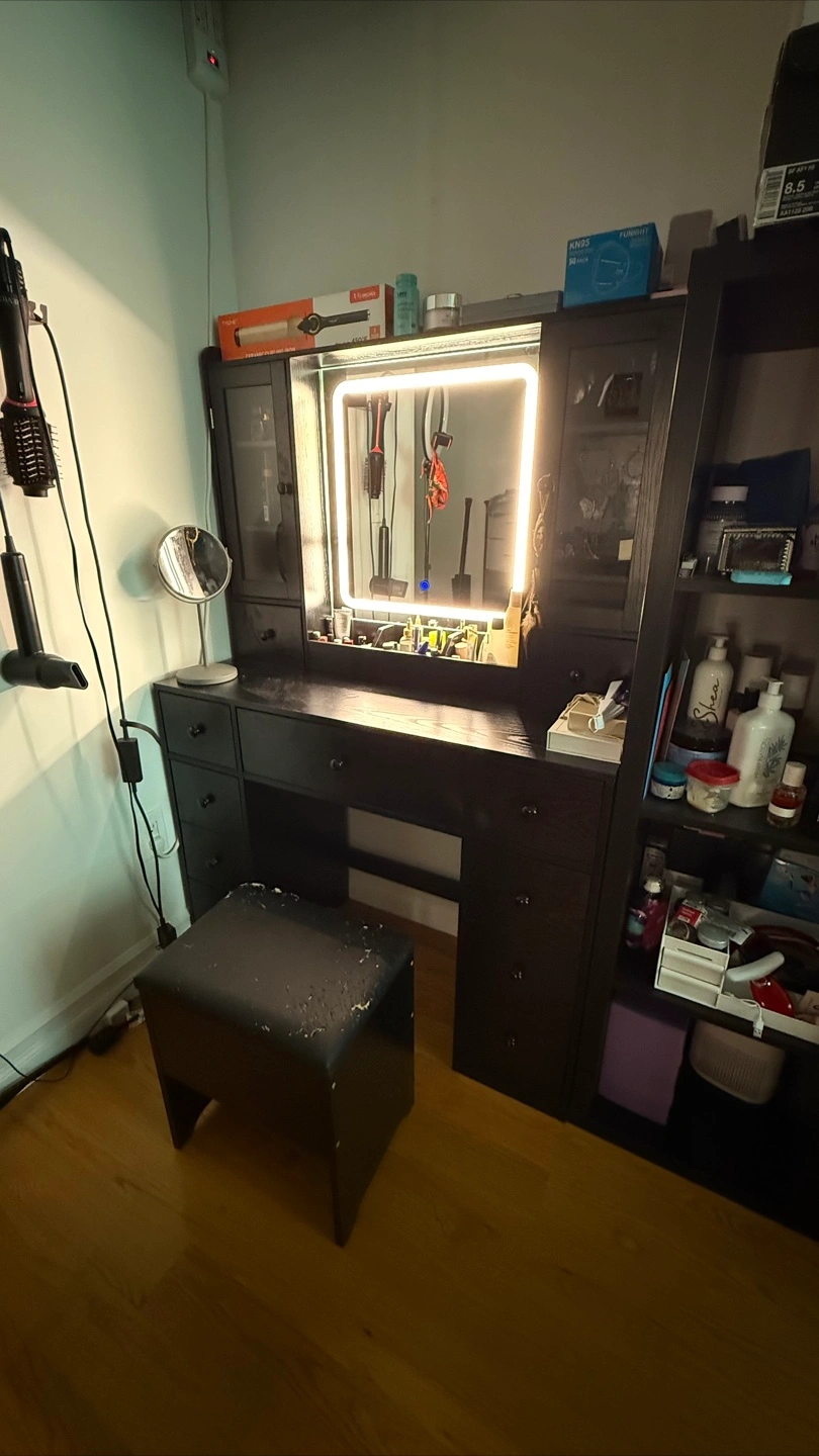 Selling a black vanity table with a lighted mirror. It has plenty of drawers for storage and a matching stool. The stool shows some wear, but the vanity itself is in good condition. Perfect for getting ready! https://a.co/d/ja2tAvE