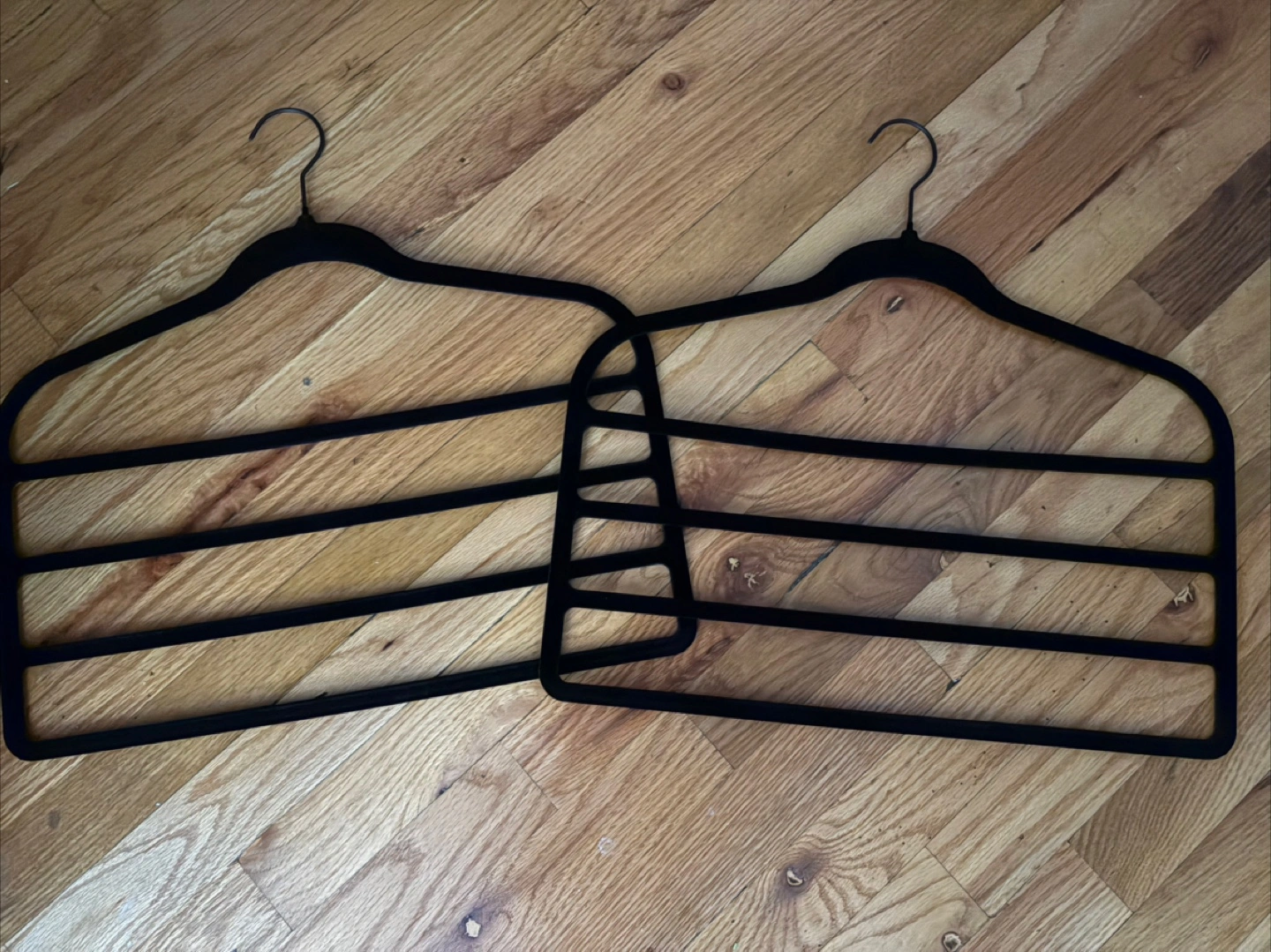 Selling a pair of black velvet multi-pants hangers. These are great for saving space in your closet and keeping your pants organized and wrinkle-free. I have two hangers for $5