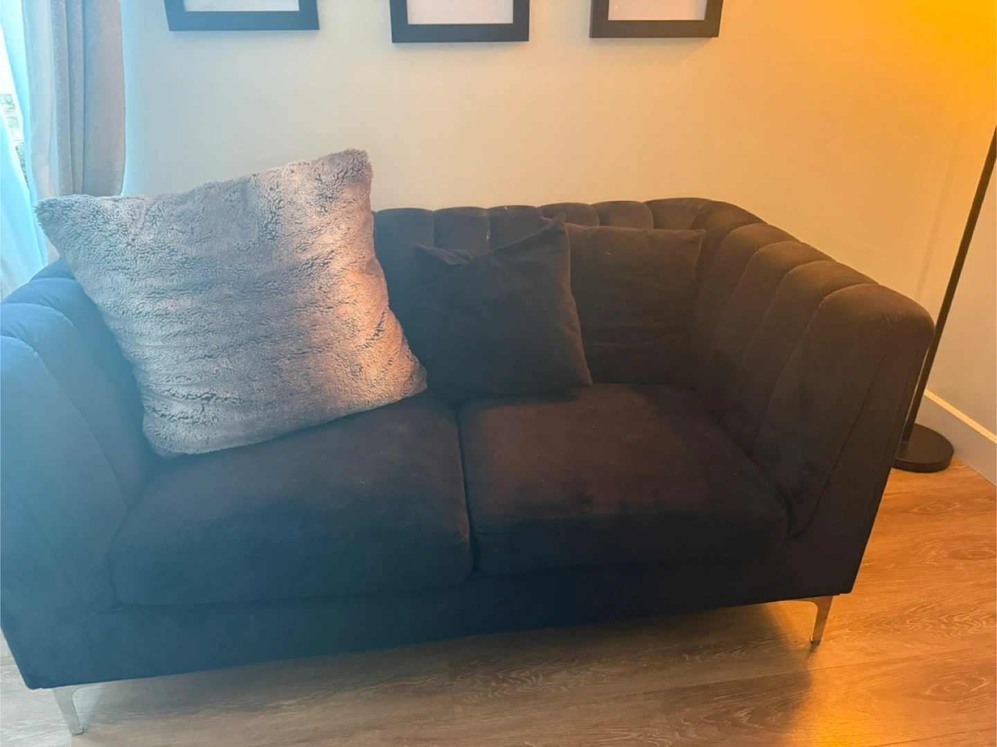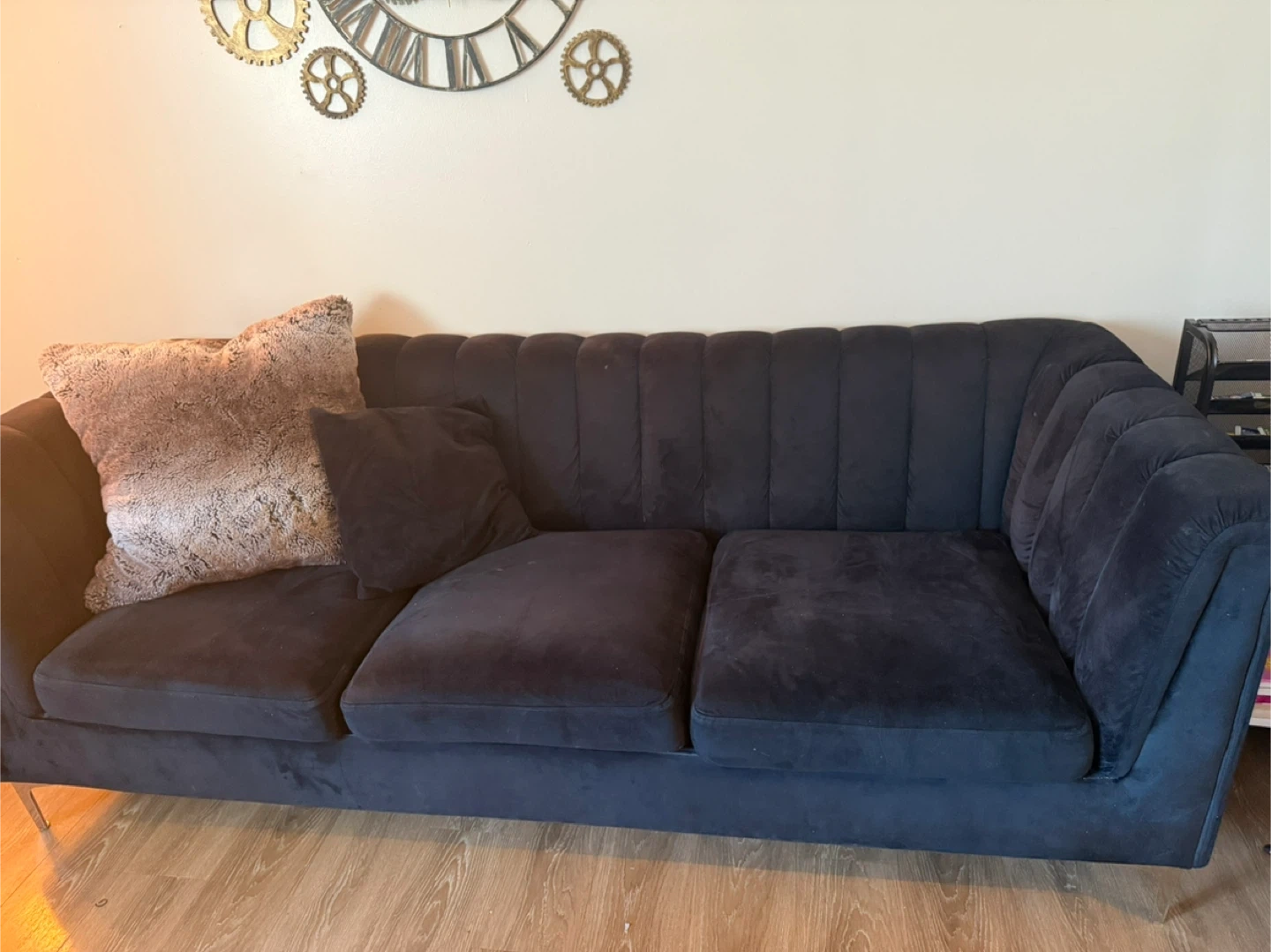 Selling a stylish black velvet sofa! It’s in great condition and would look lovely in any living room. The sofa has a sleek design and comfortable cushions, perfect for relaxing or entertaining guests