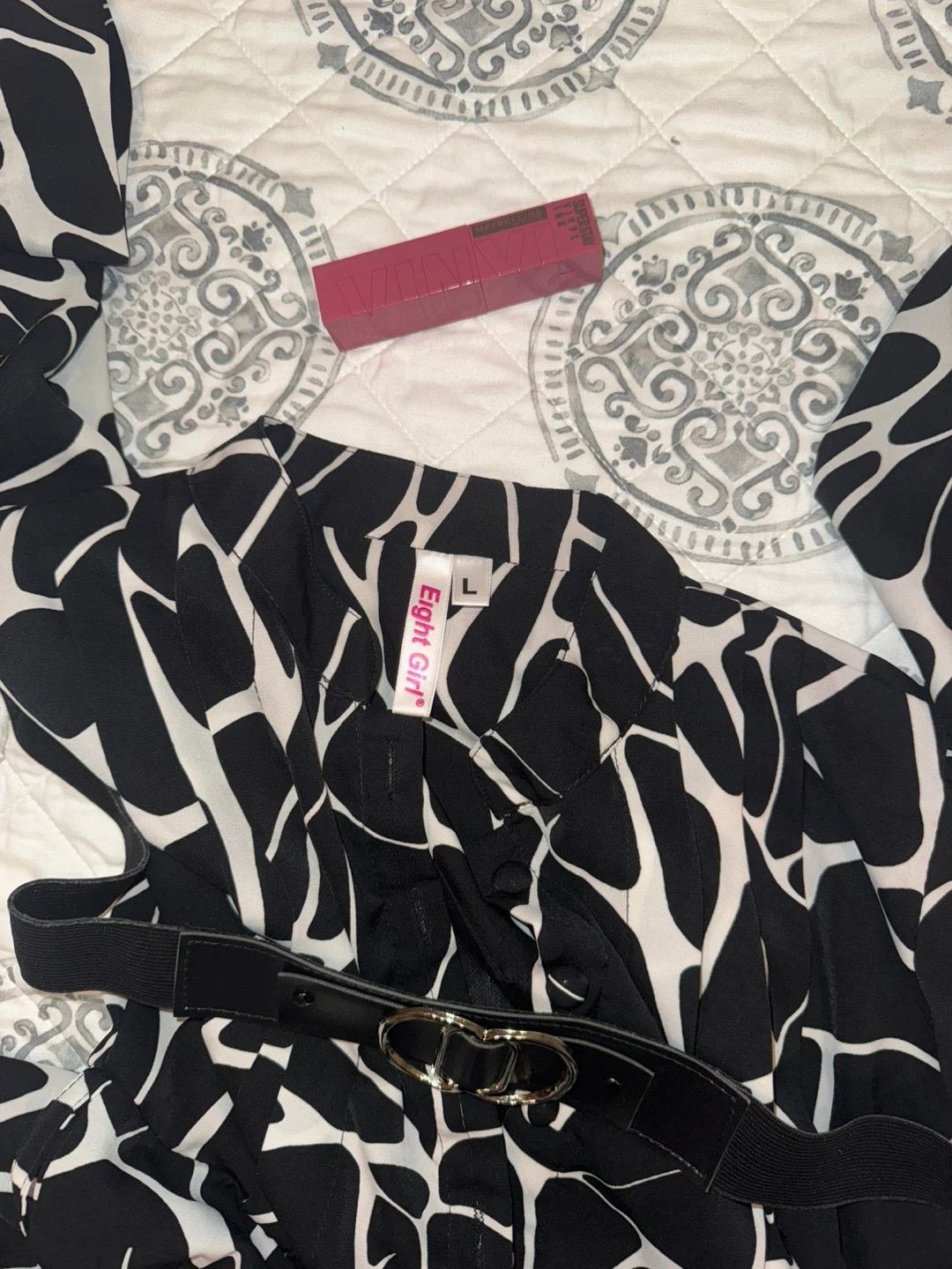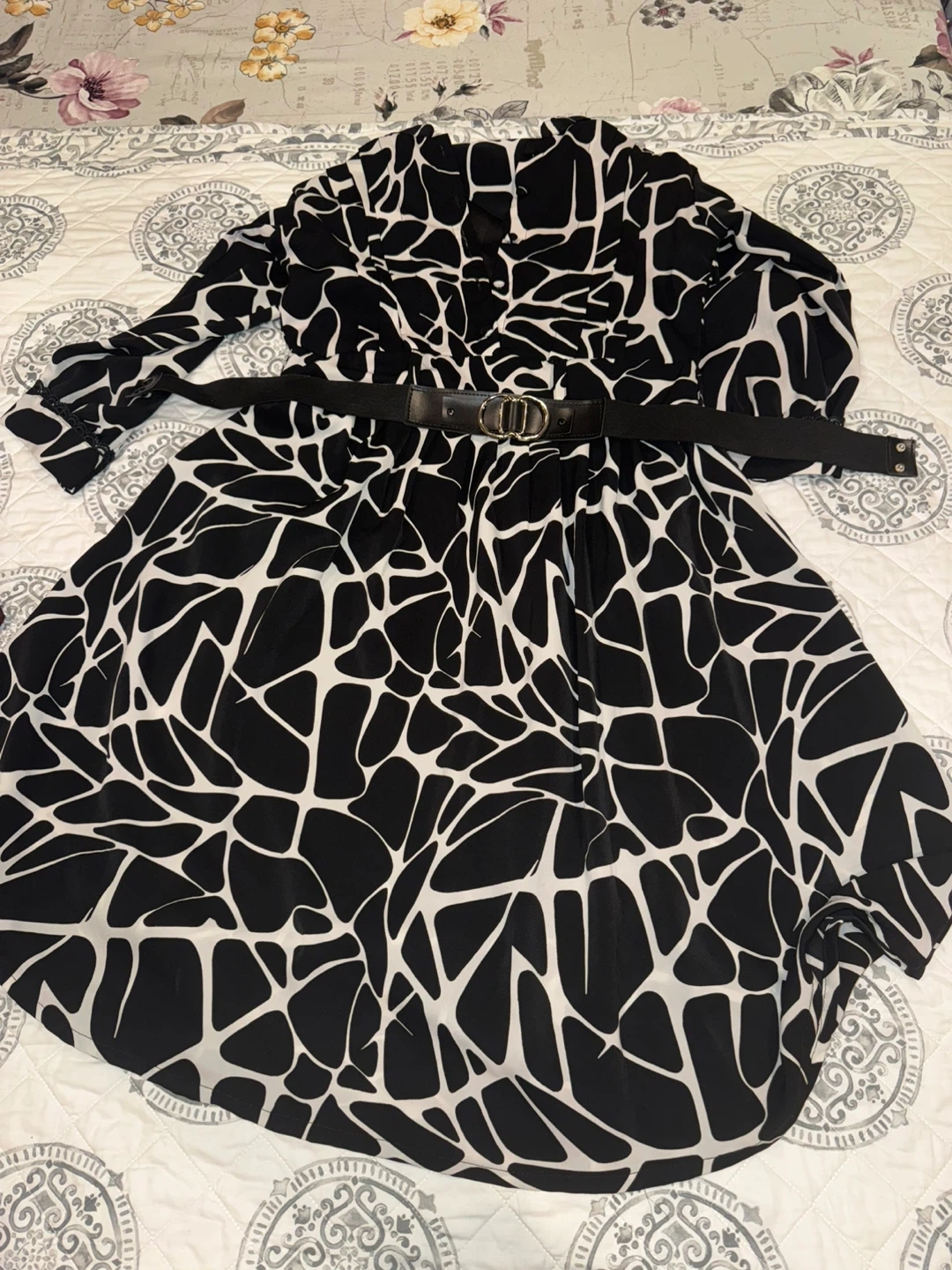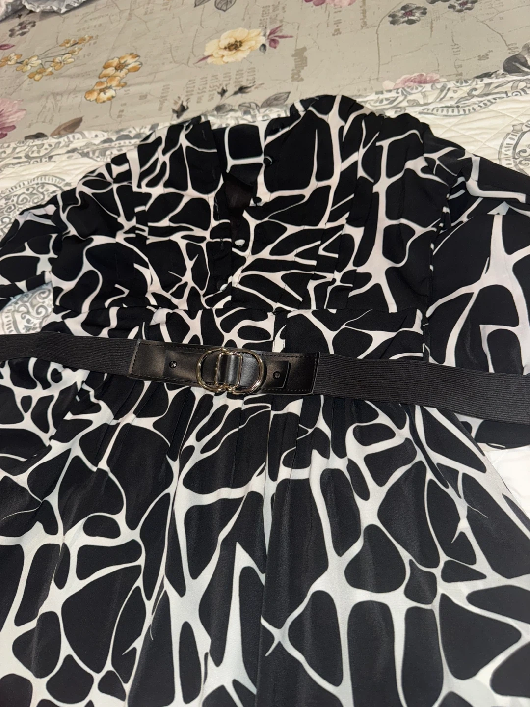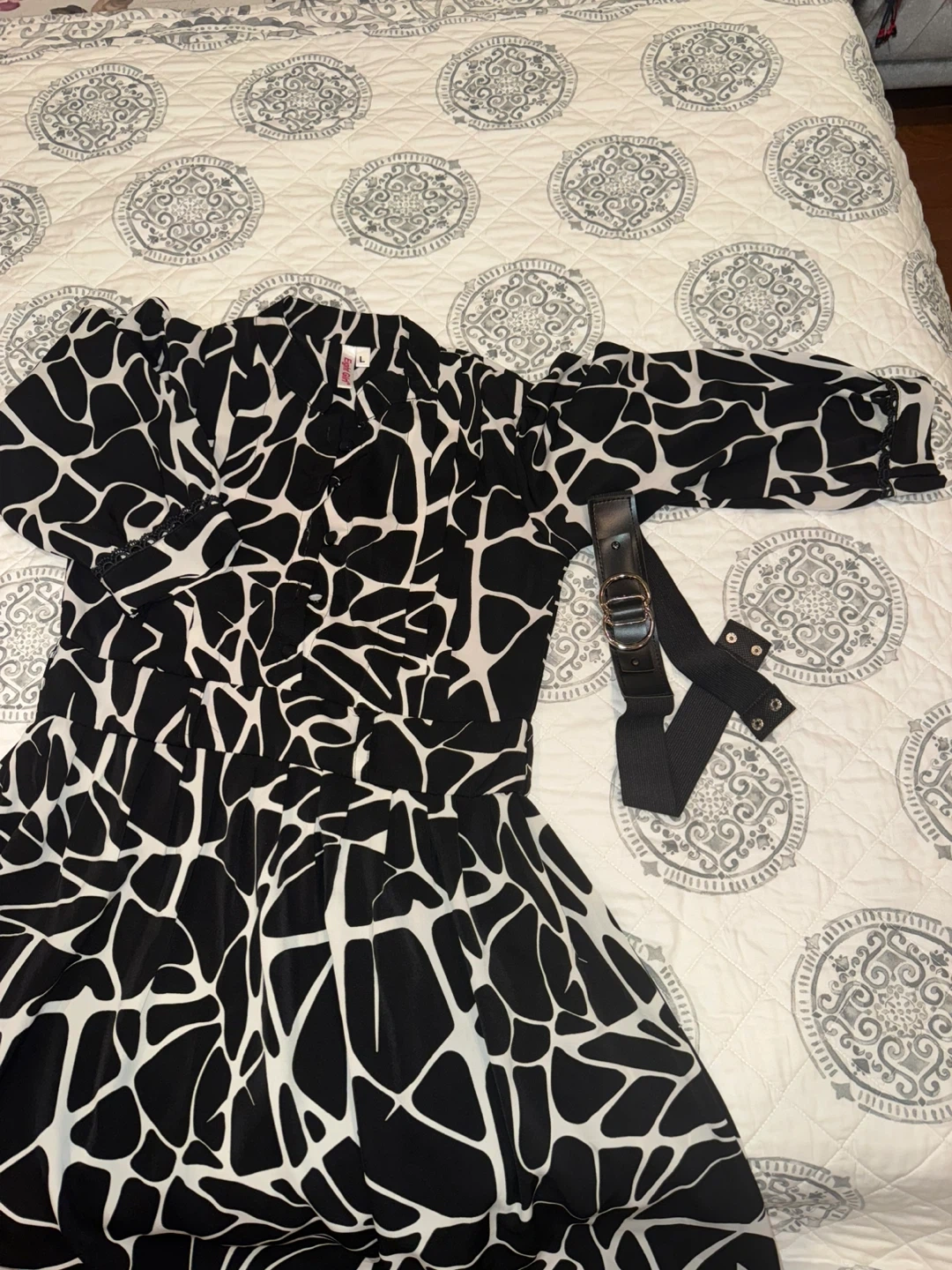 Selling a cute dress in a striking black and white pattern! It comes with a stylish belt to cinch the waist. The size is Large. Perfect for any occasion!