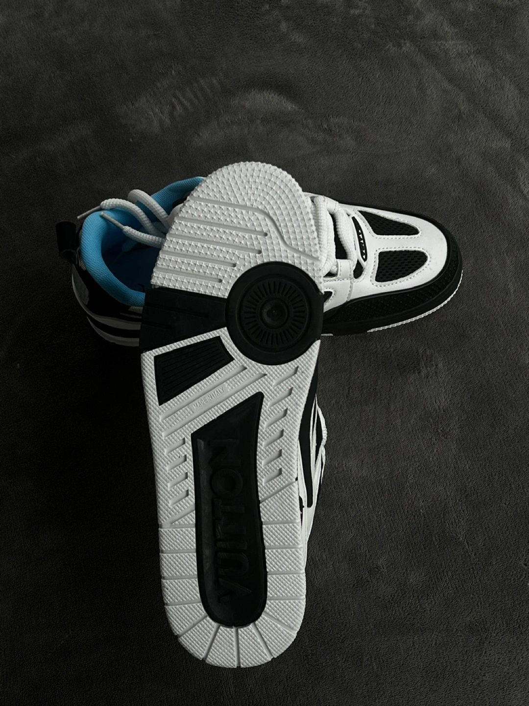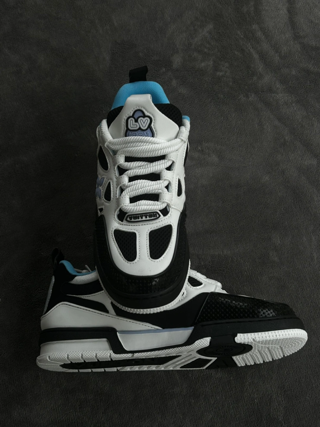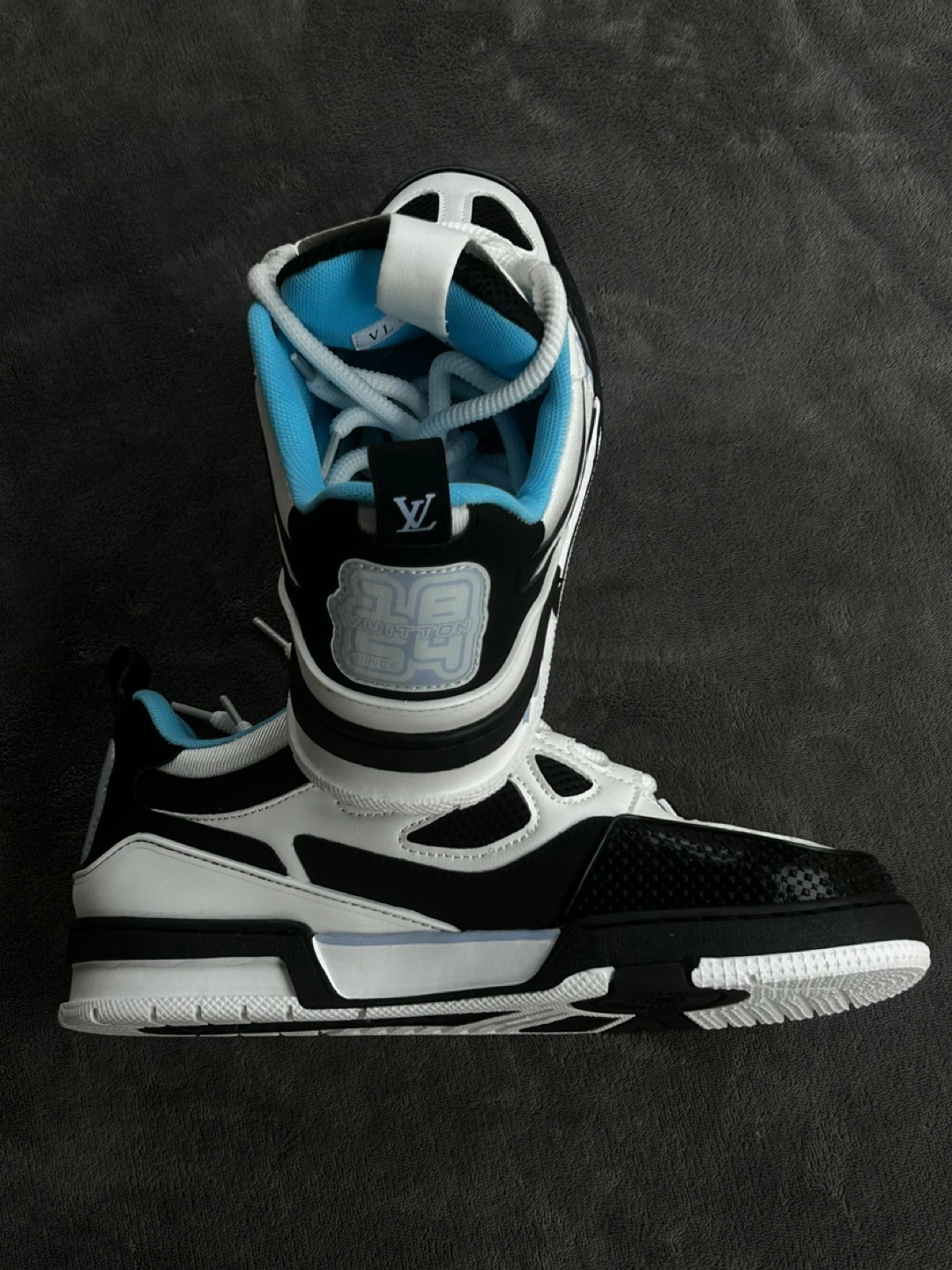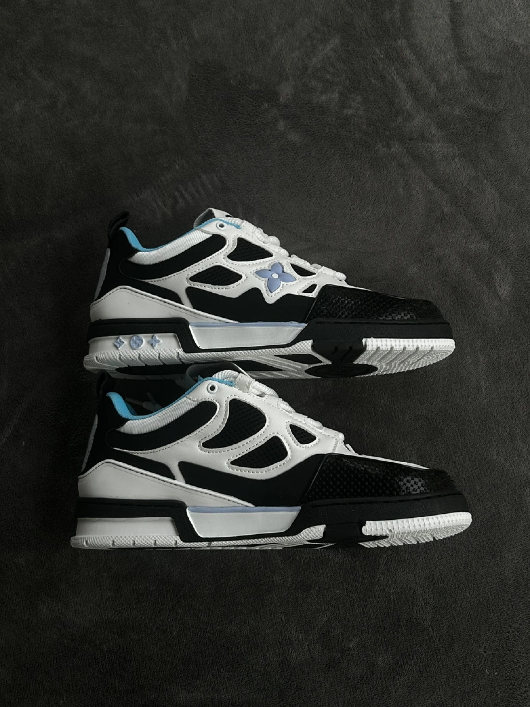 12High-quality low-top sneakers with a black, white, and light blue color scheme. Comfortable padded interior, lace-up closure, and durable rubber sole. Brand-new and unworn. Available in size 8.5
