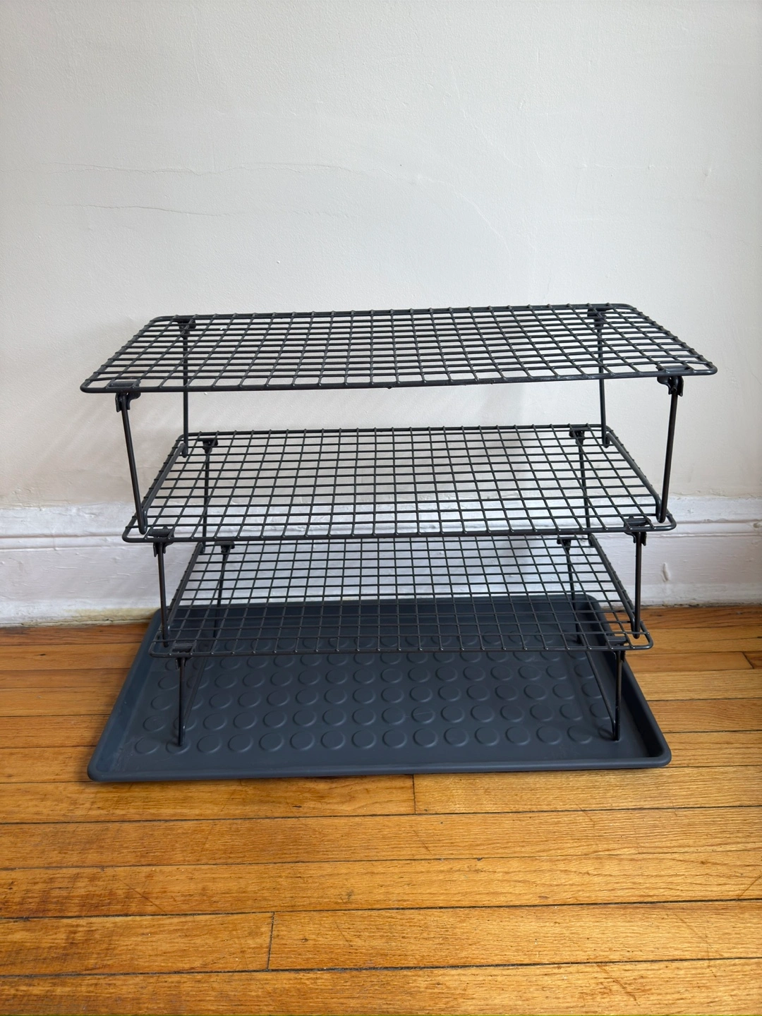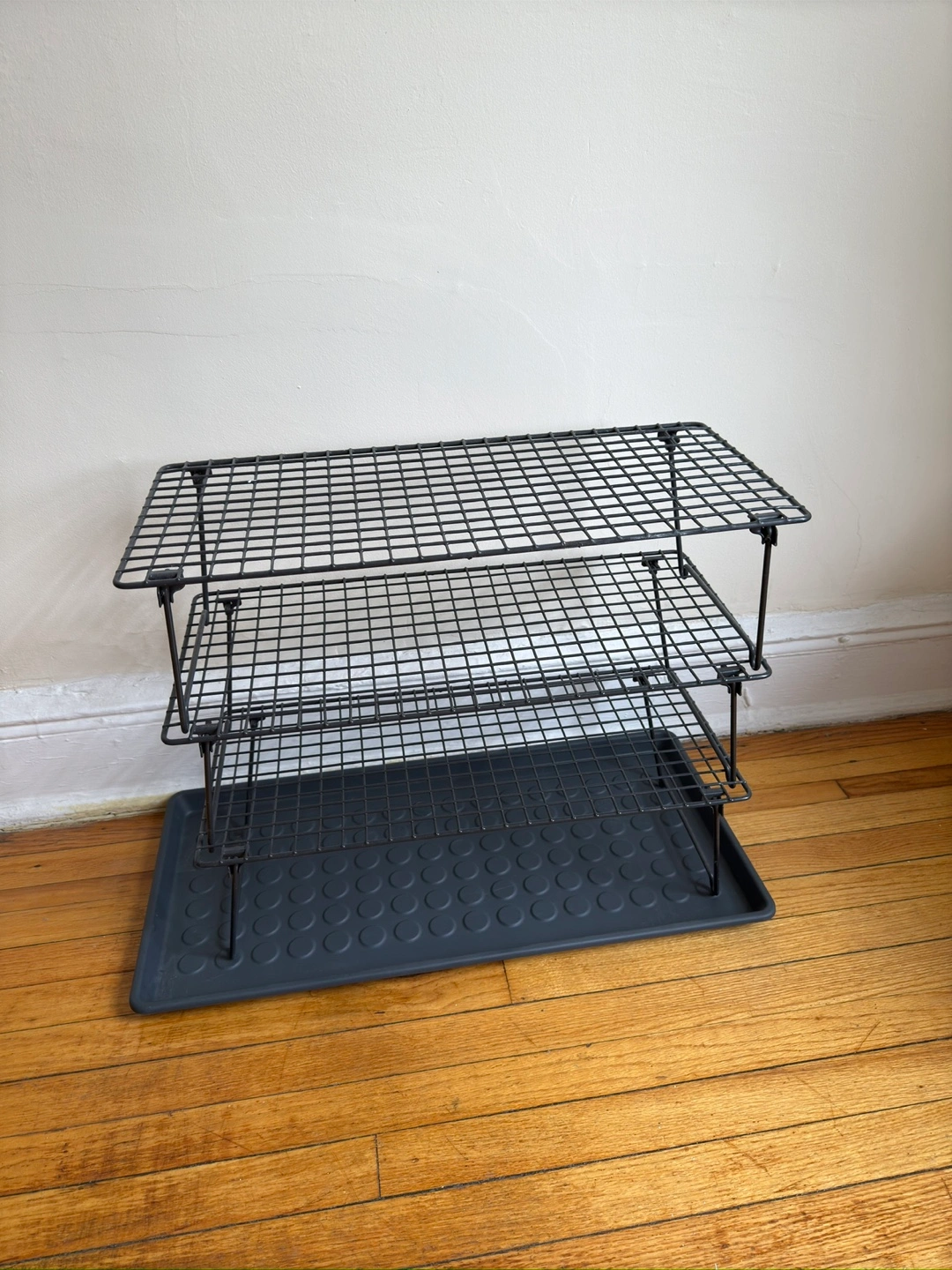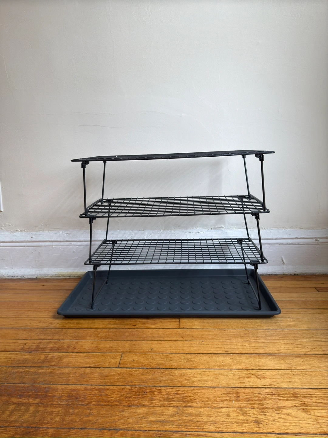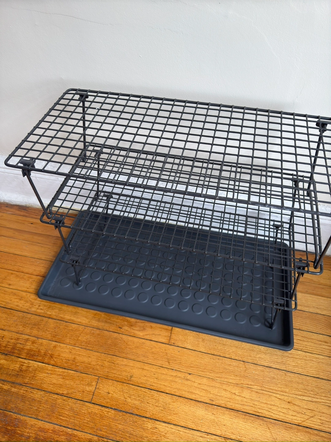 51I'm selling a black wire shoe rack that comes with a tray. It's in good condition and ready to help organize your footwear! Perfect for entryways or closets