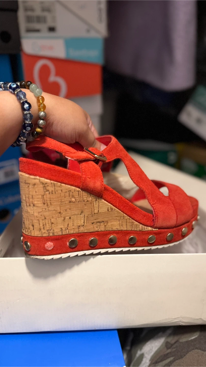 60These stylish Bleecker & Bond sandals feature a vibrant red suede upper and a comfortable wedge heel. The cork wedge adds a touch of natural texture, while the studded detailing along the sole gives them a unique edge. Perfect for adding a pop of color to your summer outfits!