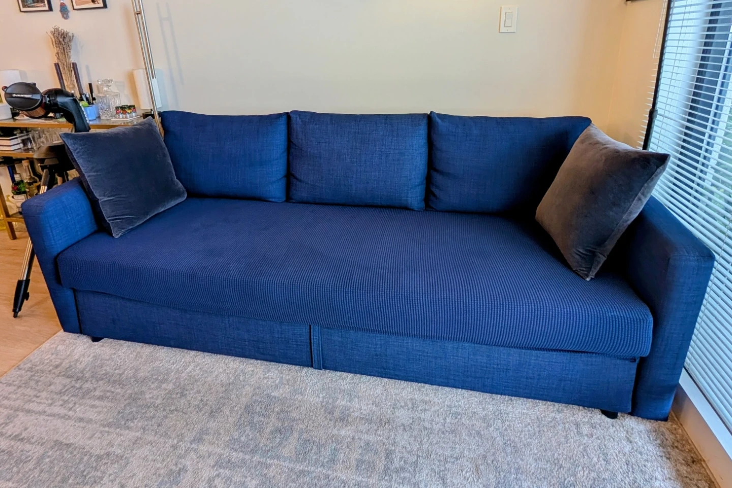 65Selling a comfy blue sofa! It's in great condition and would be a perfect addition to any living room. Can be converted to a bed from a pull out underneath. IKEA Friheten. Used with a cover on top, so no mark or spot. Fully clean and like-new. Sleeper-sofa, with storage underneath.