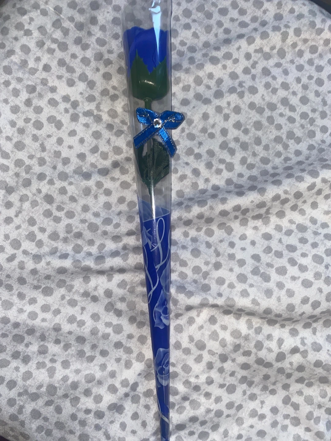 98Giving away blue artificial rose encased in a decorative blue tube. It's in great condition and would make a lovely gift or decoration!
