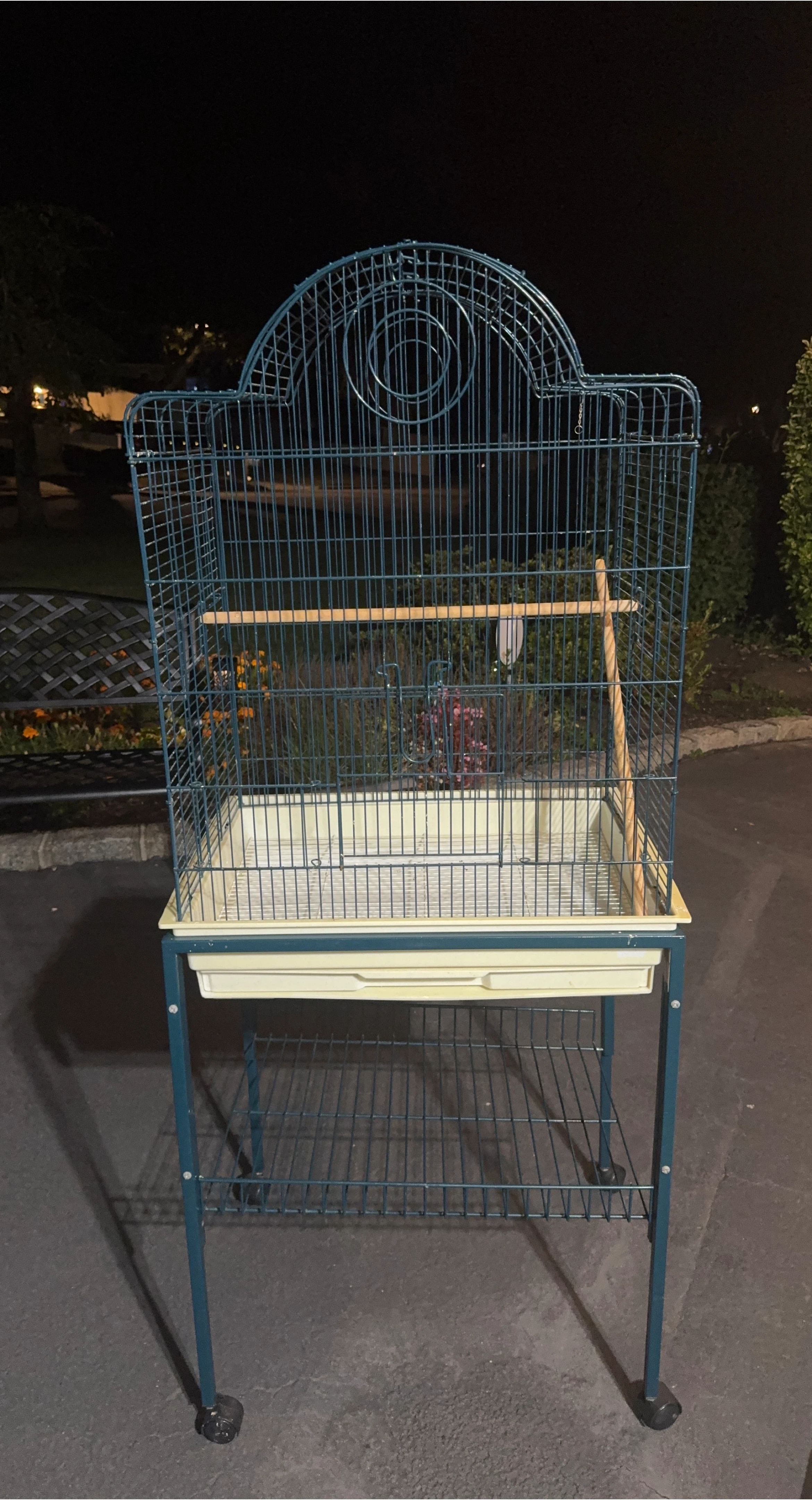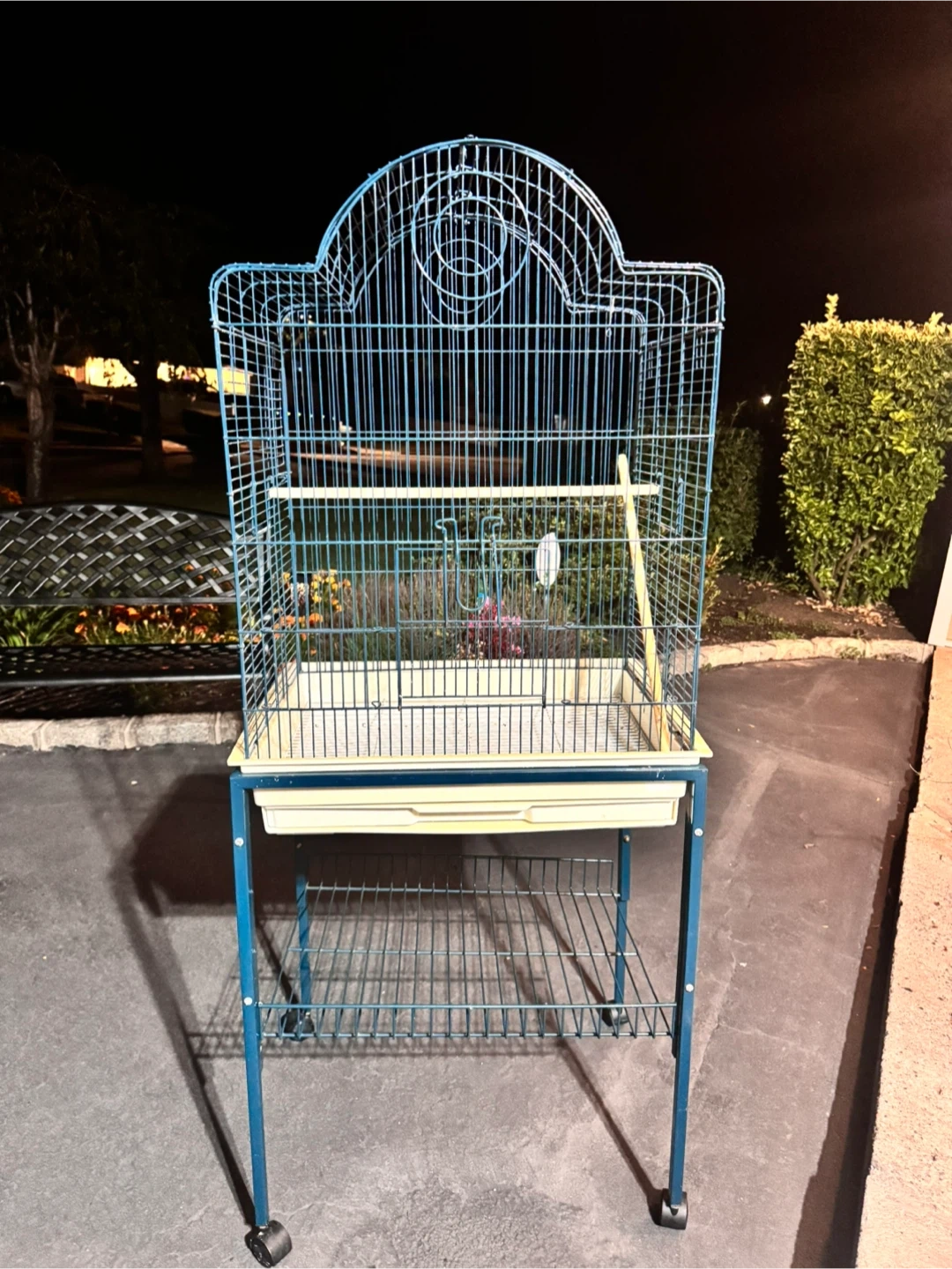 Selling a blue bird cage with a stand! It's in good condition and ready for a new feathered friend. The cage has a removable tray for easy cleaning and a perch for your bird to enjoy. Perfect for small to medium-sized birds