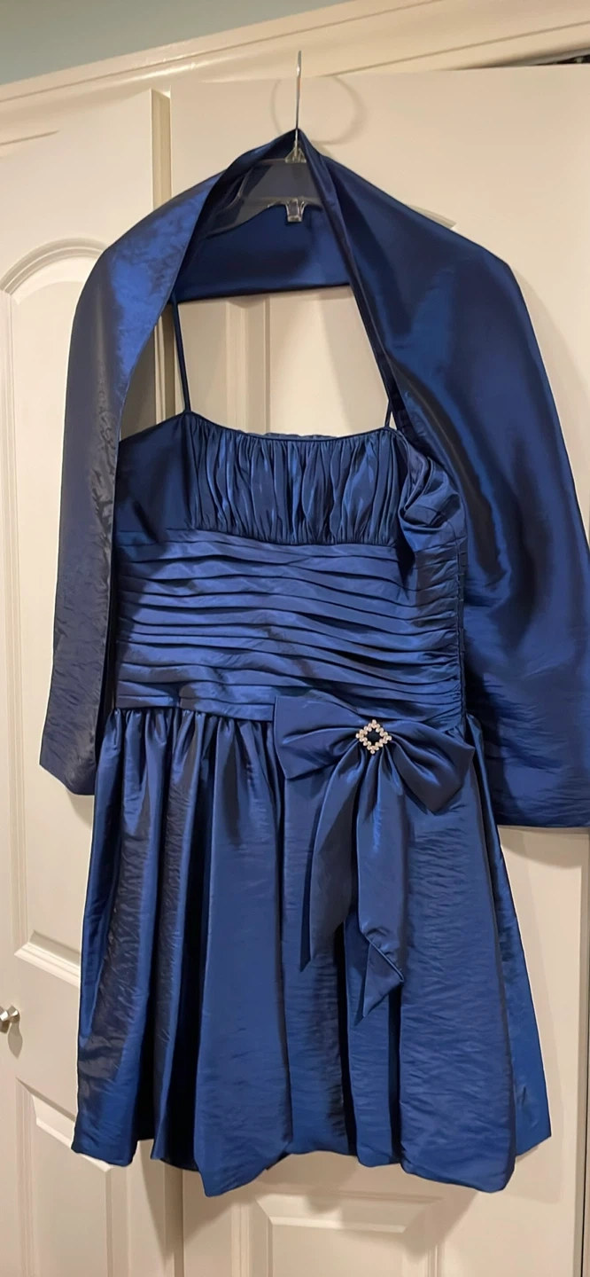 60Here's a cute blue dress with a matching bolero! It's perfect for a party or special occasion. The dress features a ruched bodice and a bow detail at the waist. The bolero is a nice added touch for cooler evenings
